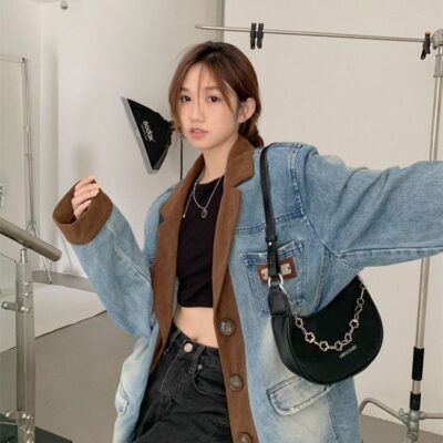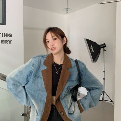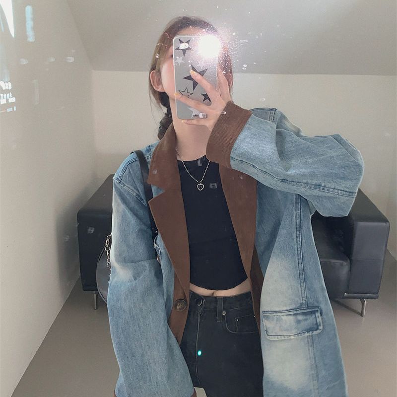 Áo khoác denim phù hợp với áo khoác mùa xuân của phụ nữ Hồng Kông phong cách retro tất cả các trận đấu khâu thiết kế cảm giác thích hợp phù hợp với áo khoác