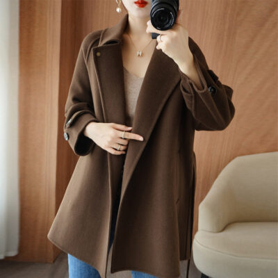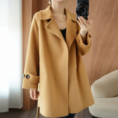 Áo khoác len 2 mặt màu vàng nữ dáng ngắn size nhỏ thu đông áo khoác len thắt eo eo áo khoác len bán buôn