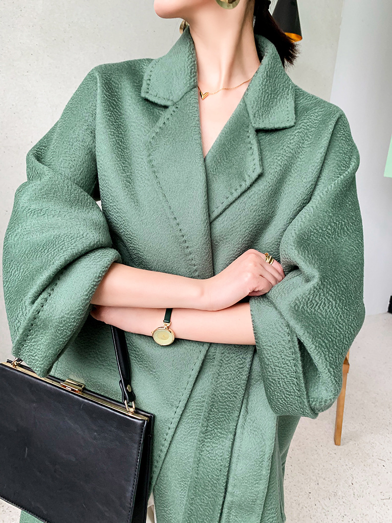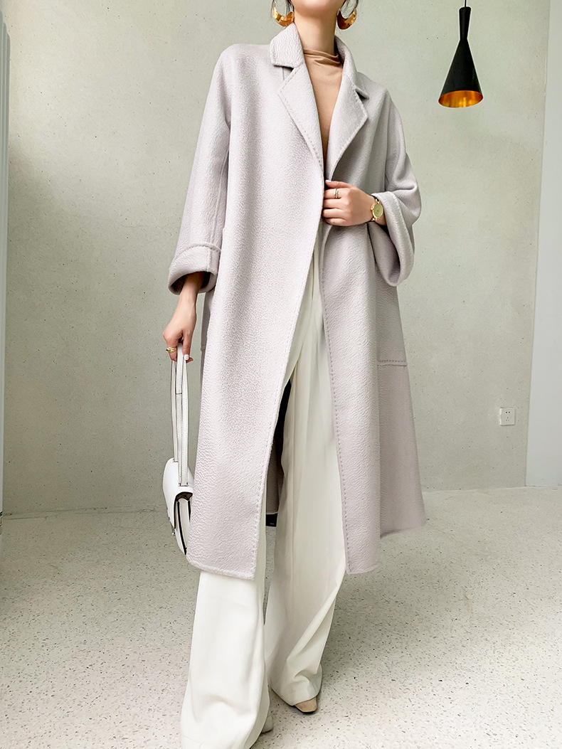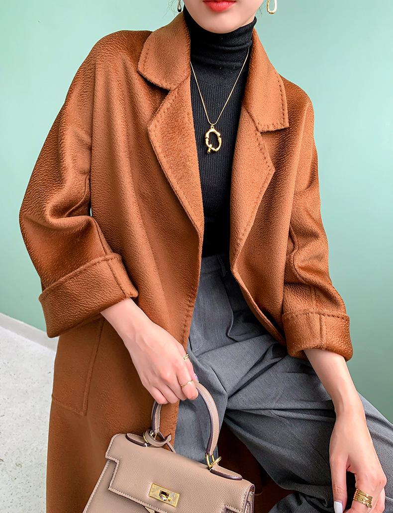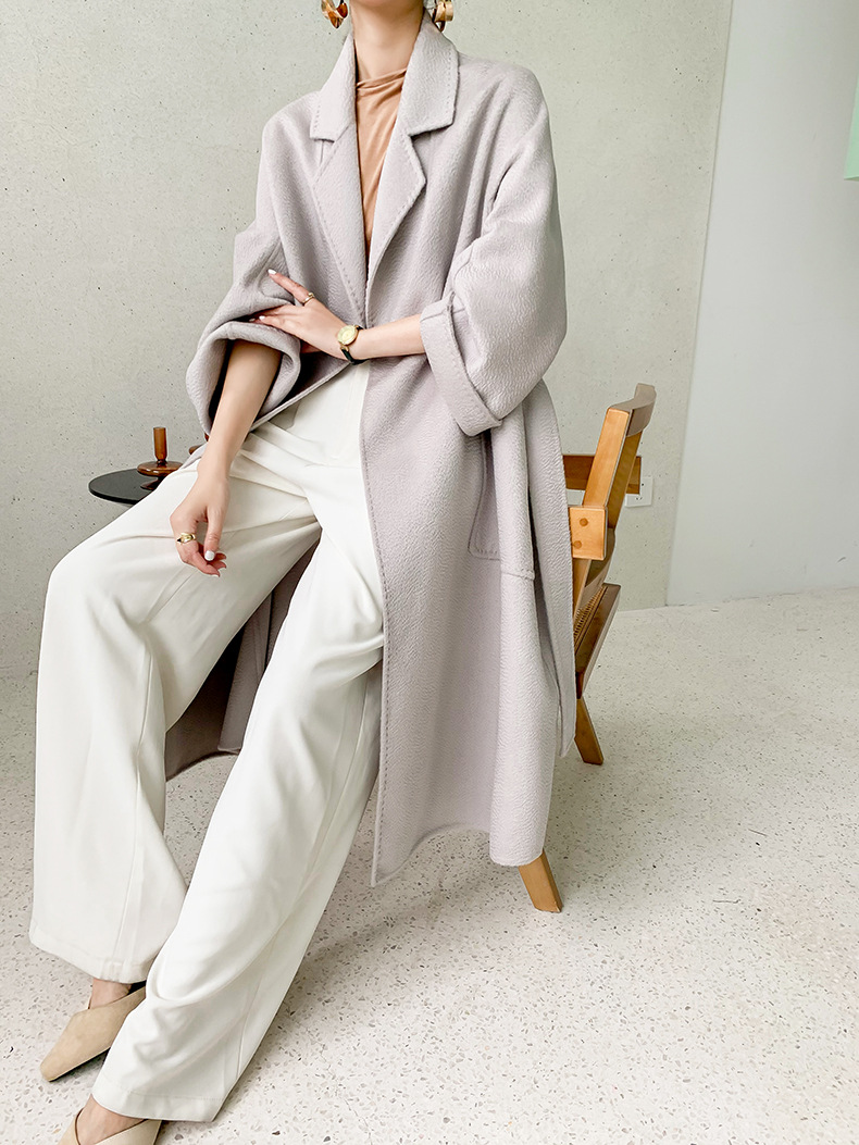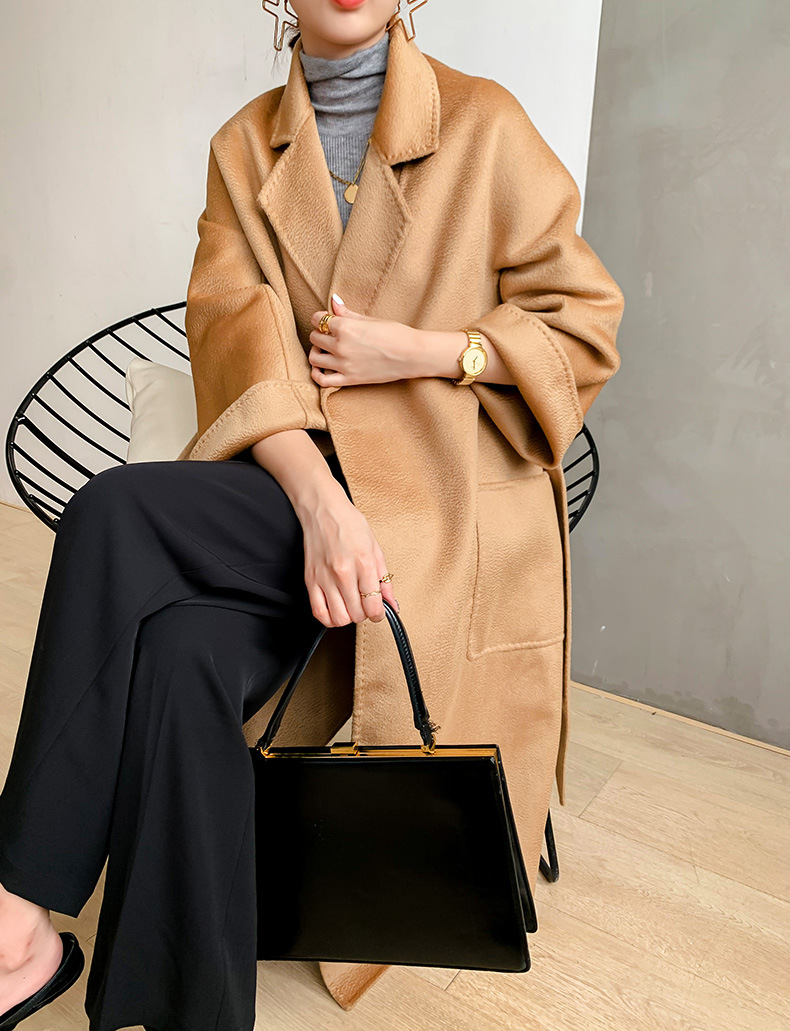 Áo khoác len cashmere hai mặt gợn sóng nước Max dài vừa phải cho nữ áo khoác len buộc dây phong cách Hàn Quốc