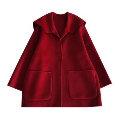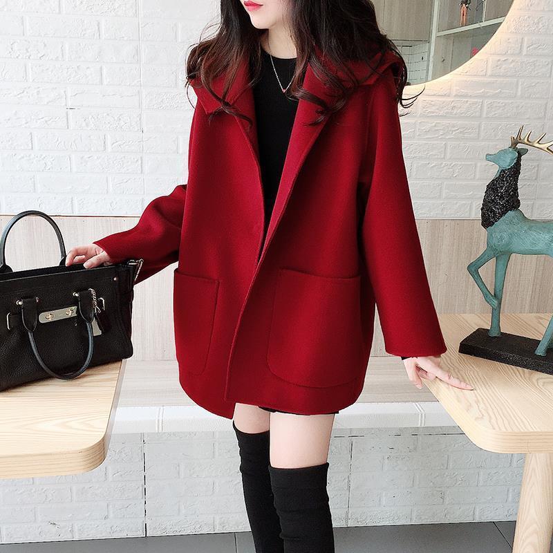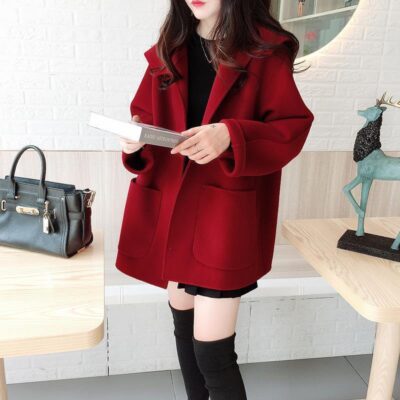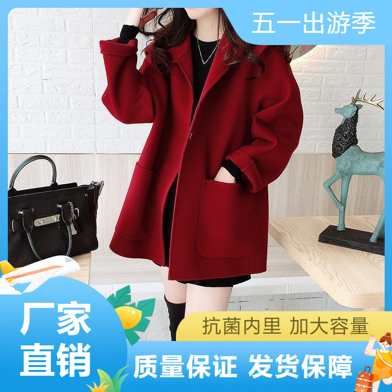 Áo khoác len đỏ lễ hội len hai mặt nữ mùa thu đông áo khoác len hai mặt nhỏ