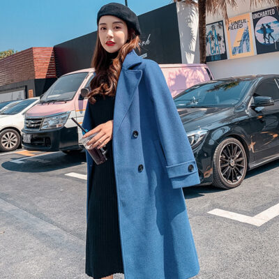 Áo khoác len nữ chấm bi xuyên biên giới phiên bản Hàn Quốc thu đông 2023 áo khoác len hai hàng khuy màu xanh khói thời trang nữ