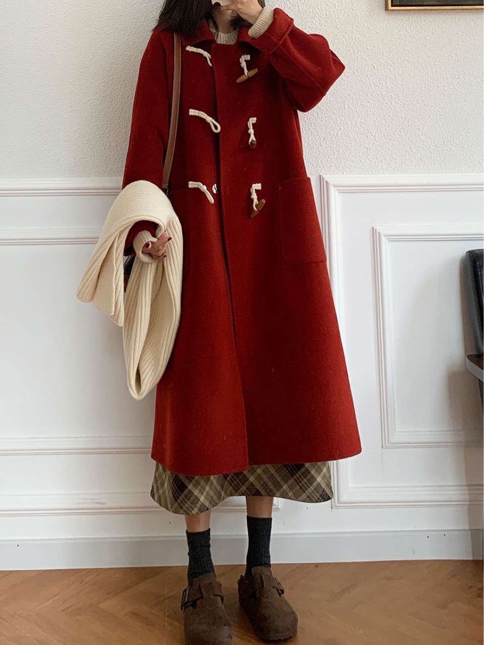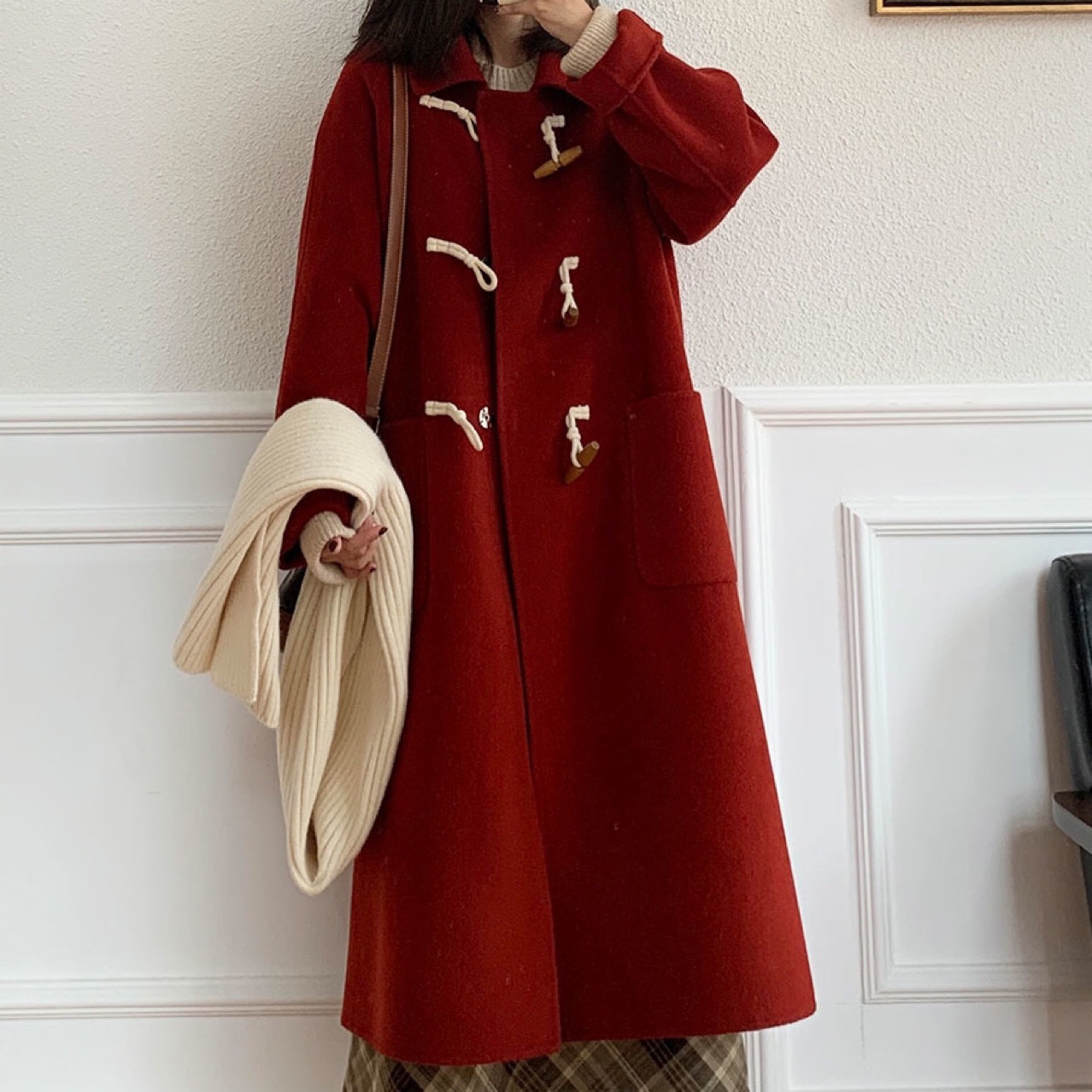 Áo khoác len nút sừng đỏ cho nữ nhỏ mùa xuân 2023 trung dài phong cách đại học áo khoác len dày