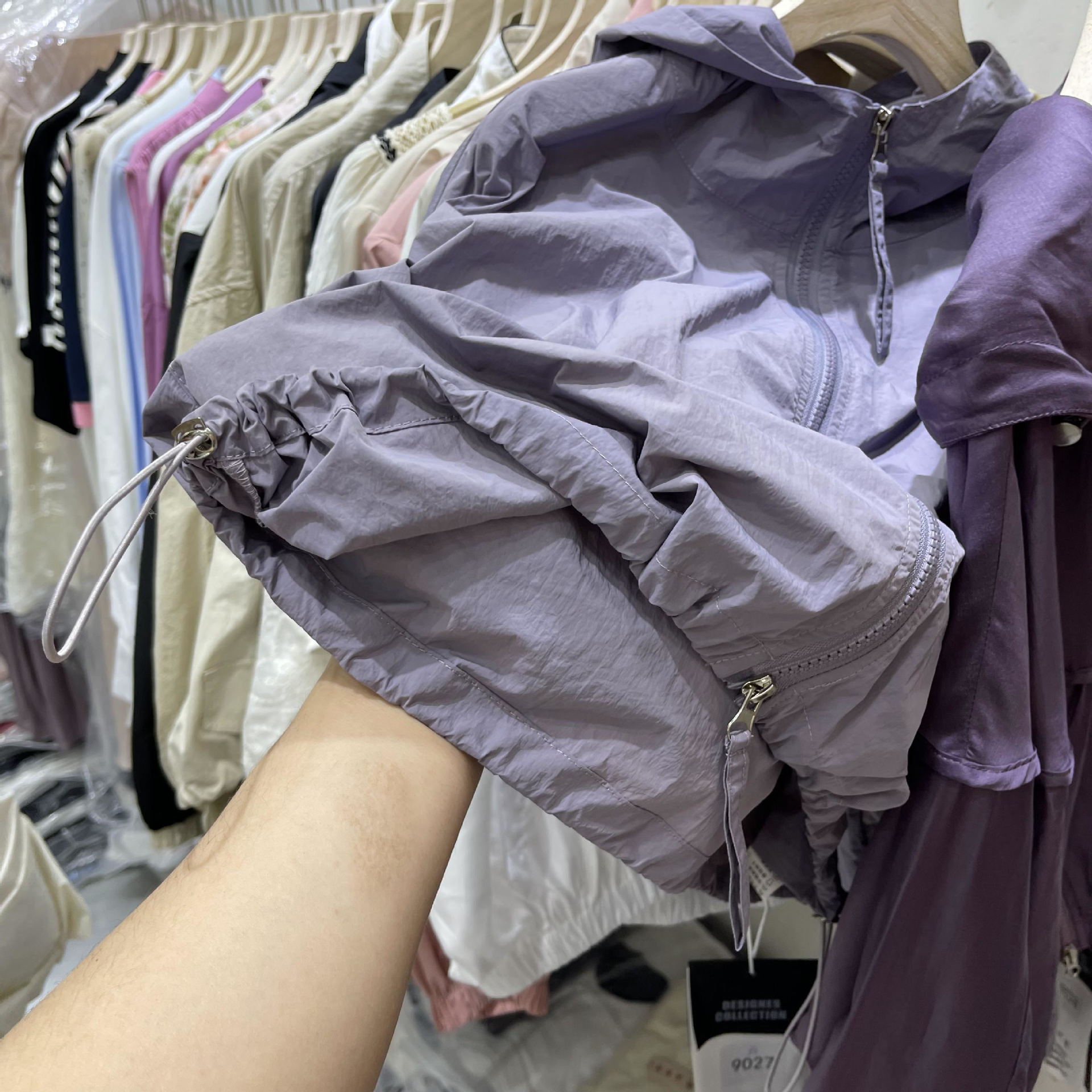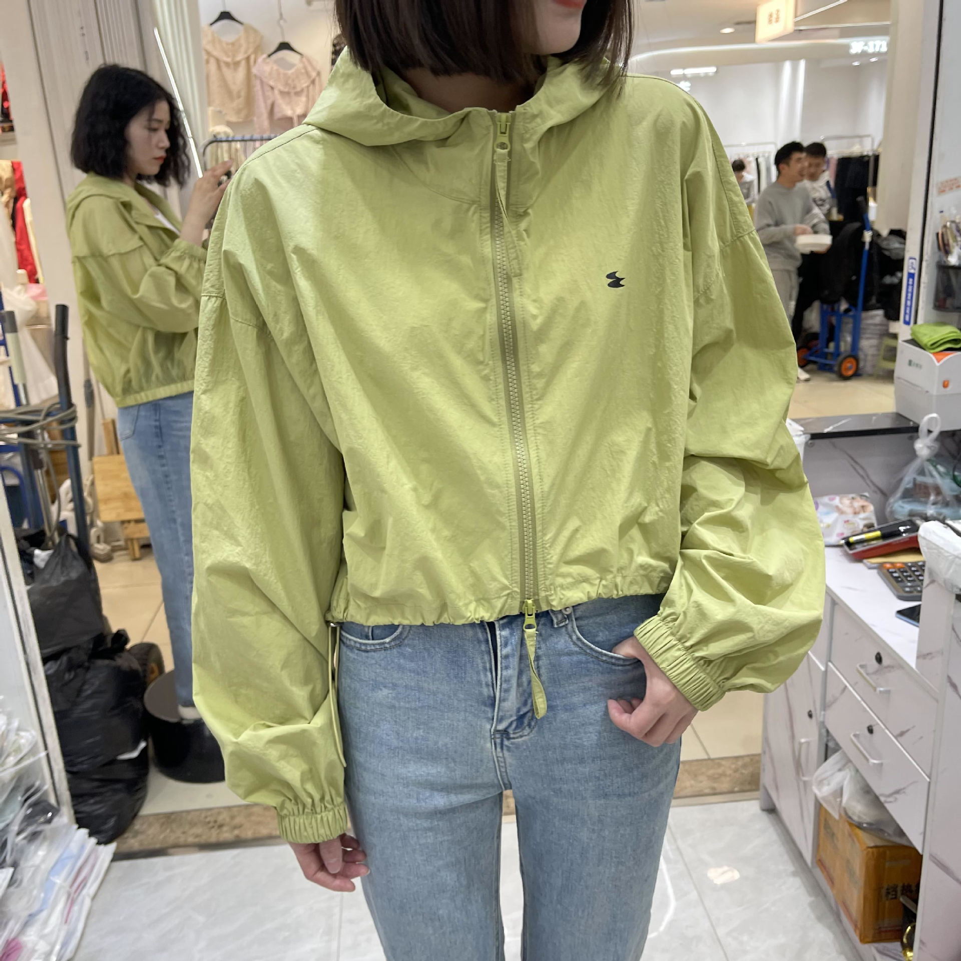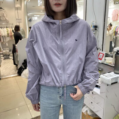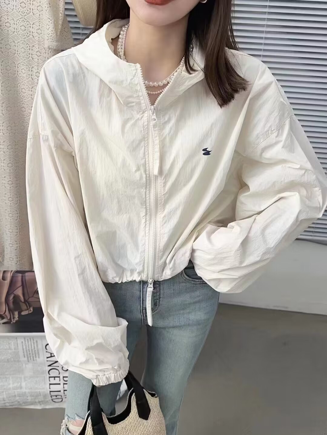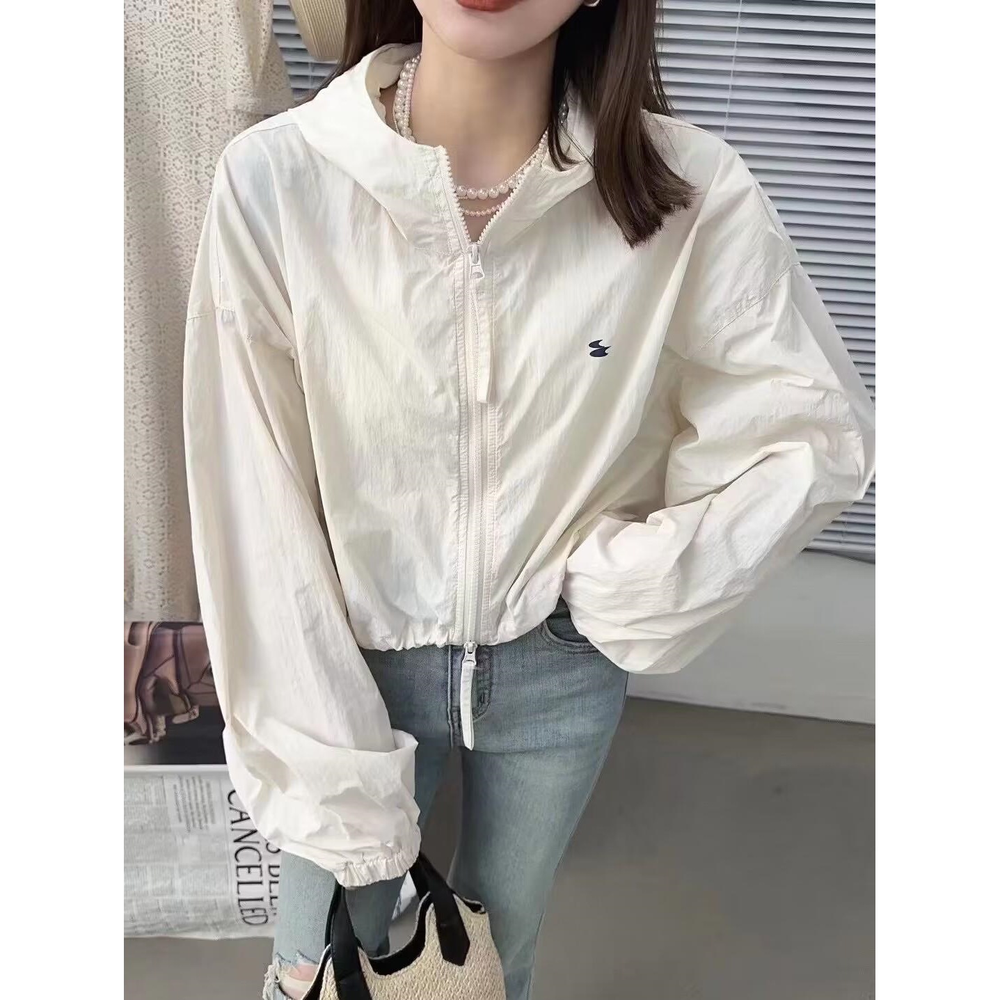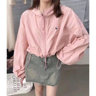 Áo khoác ngắn dây rút có mũ rộng rãi áo khoác ngắn dài tay áo khoác mùa xuân và mùa hè mới áo gió giản dị cho nữ quần áo chống nắng