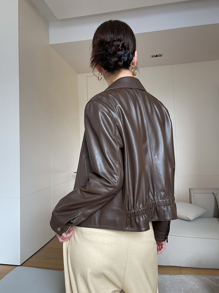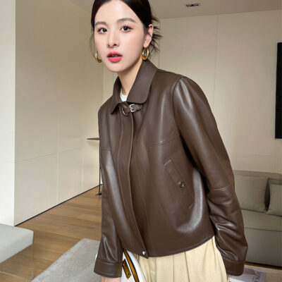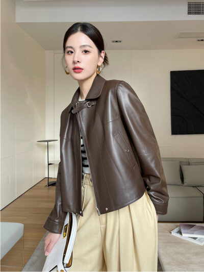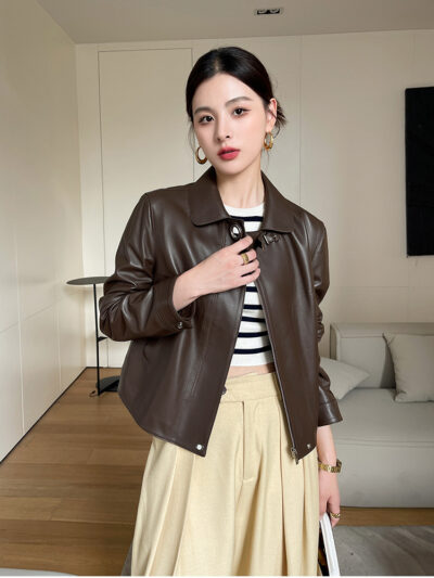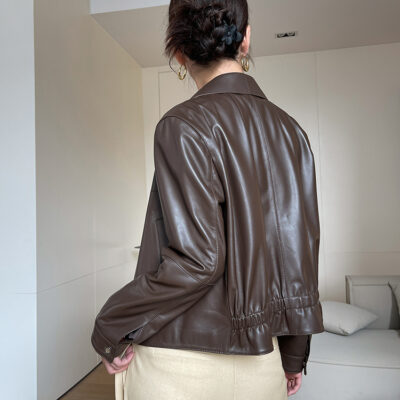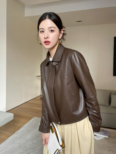 Áo khoác ngắn nữ da thật Hermes cùng kiểu dáng áo khoác skinny da cừu cao cấp mùa xuân mới 2023