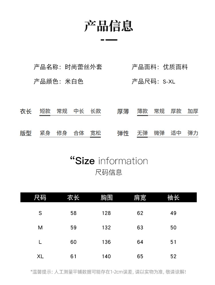 Độ dày: Trung bình Hoa văn: Màu trơn Mã sản phẩm: Z301D8825 Thương hiệu: Yilinqing Tên vải: Ren Màu sắc: Màu be Loại tay áo: Thông thường Túi: Dây kéo Thành phần vải chính: Polyester (Sợi polyester) Nguồn xuyên biên giới: Không Kích thước: S/M/ Phiên bản L/XL/XL: Loại rộng Chiều dài: Ngắn (40cm