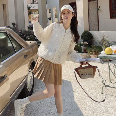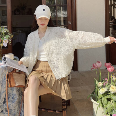 Áo khoác ngắn ren khoét lỗ quần áo nữ xuân thu 2023 phong cách mới nóng bỏng cổ đứng rời đồng phục bóng chày cardigan quần áo chống nắng