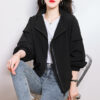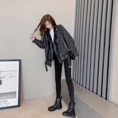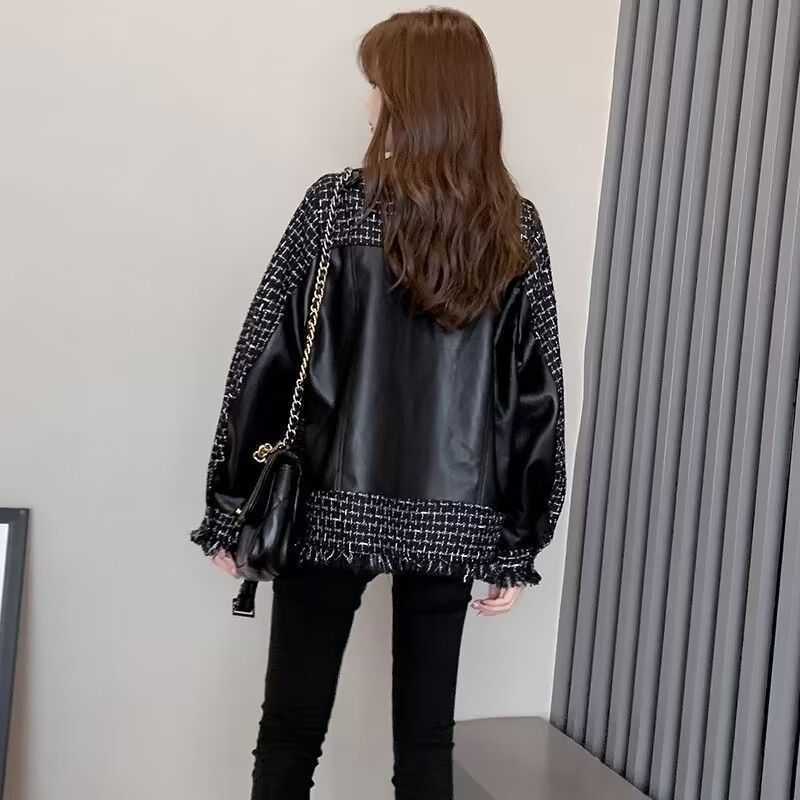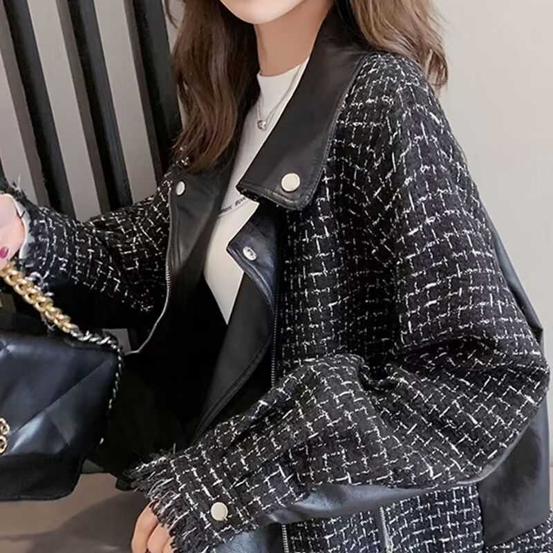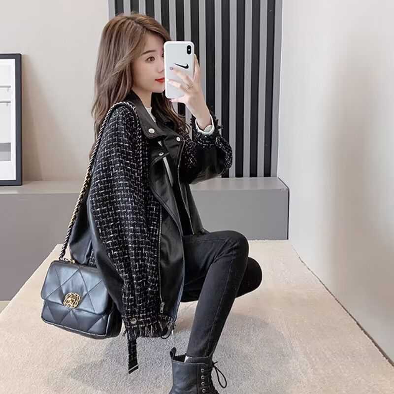 Áo khoác tua rua đường phố chiên mùa xuân và mùa thu mới của phụ nữ phù hợp với áo khoác da màu đen cỡ lớn dày nhỏ áo khoác gió dụng cụ thơm hợp thời trang