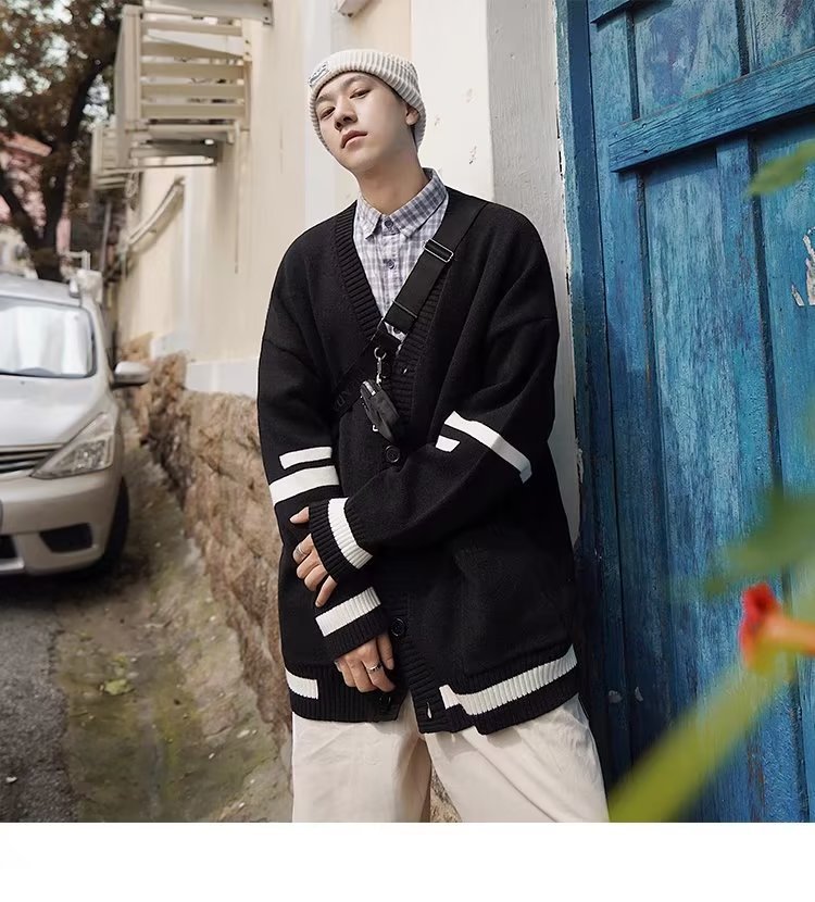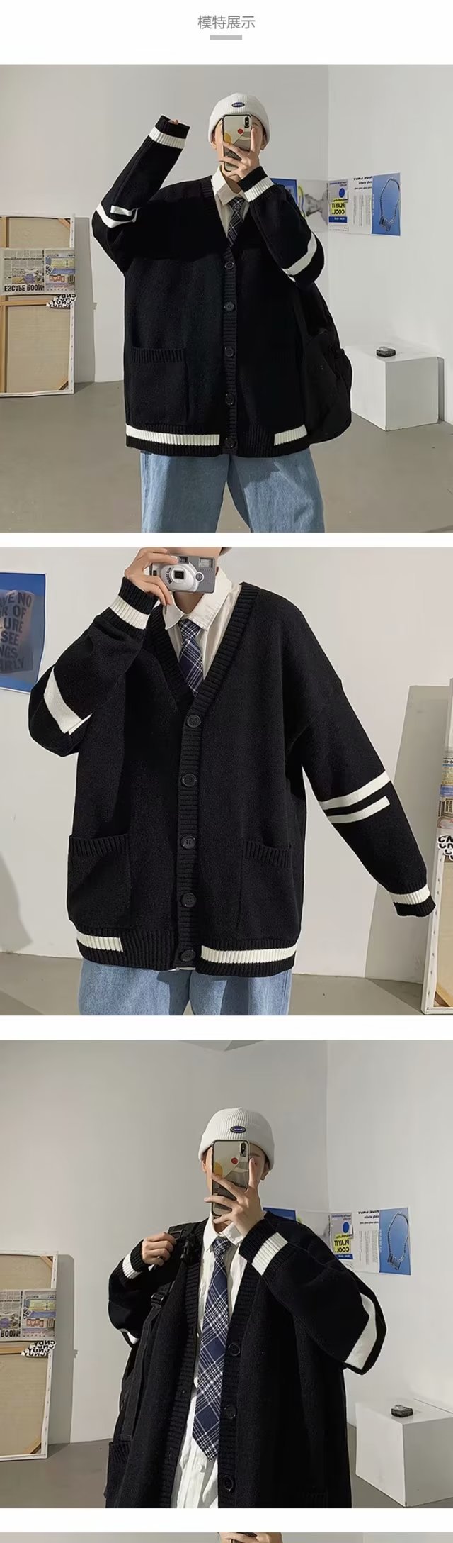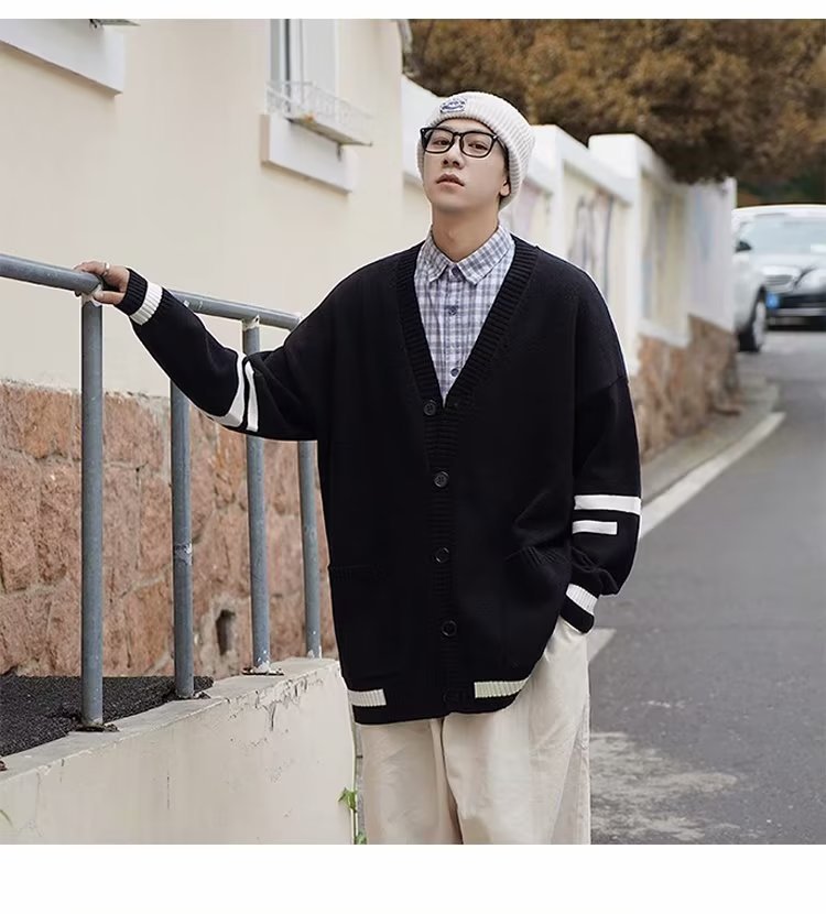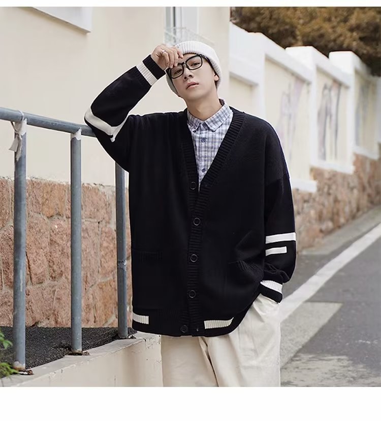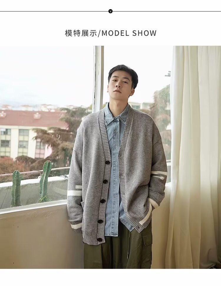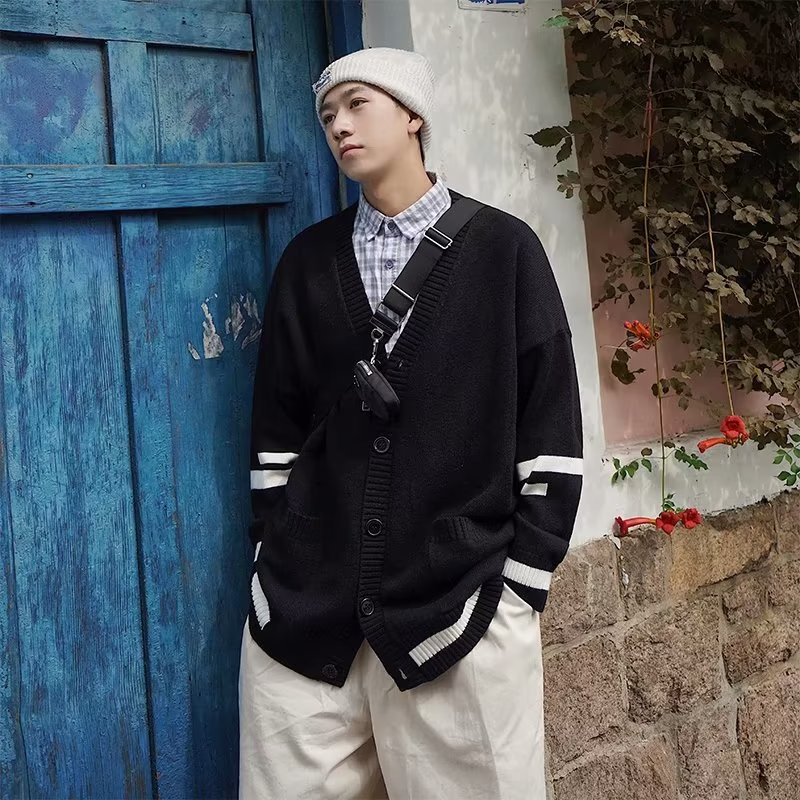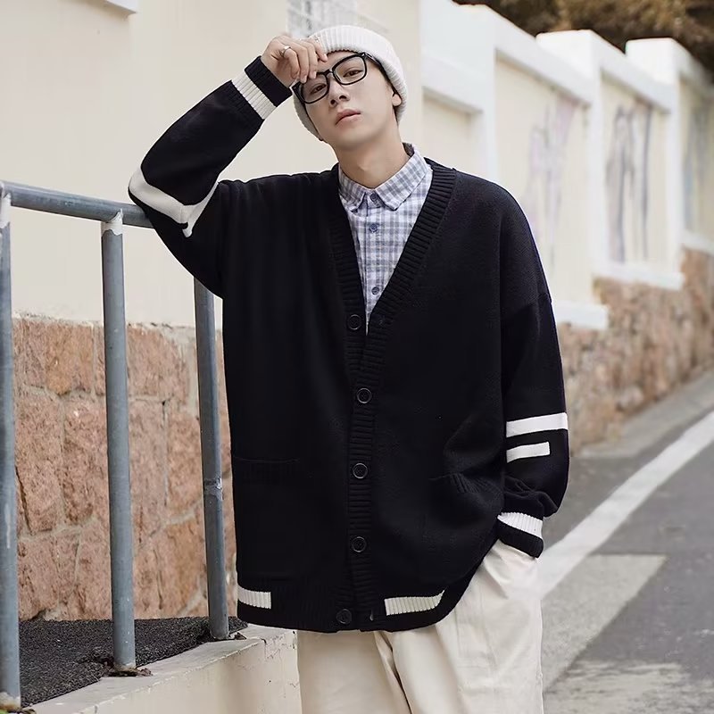 Áo len cardigan mùa thu đông nam phiên bản Hàn Quốc hợp thời trang in phong cách Hồng Kông retro dáng rộng thể thao áo khoác dệt kim thường ngày