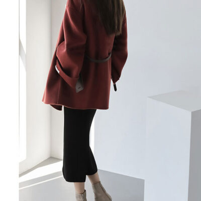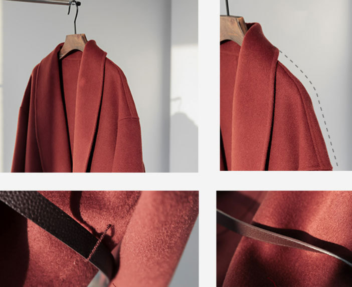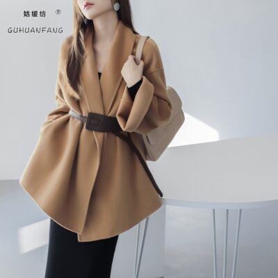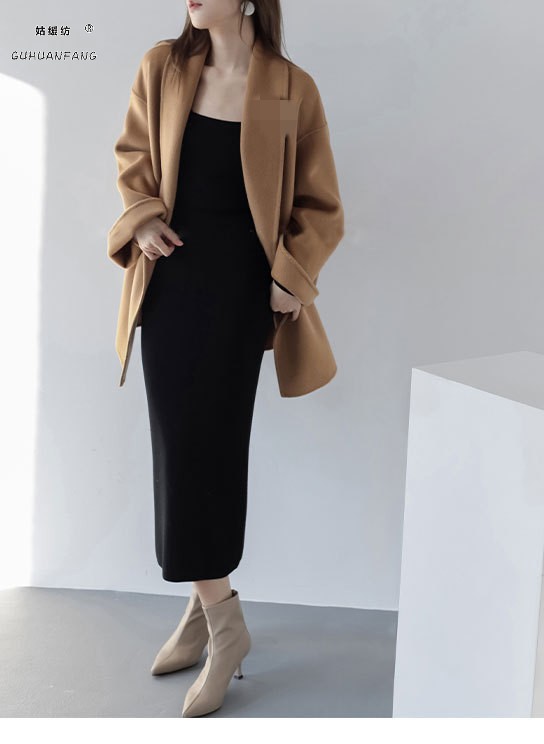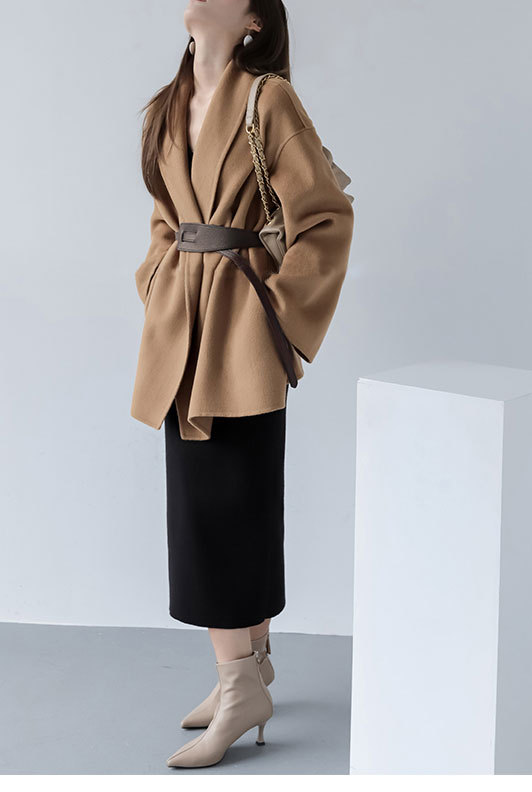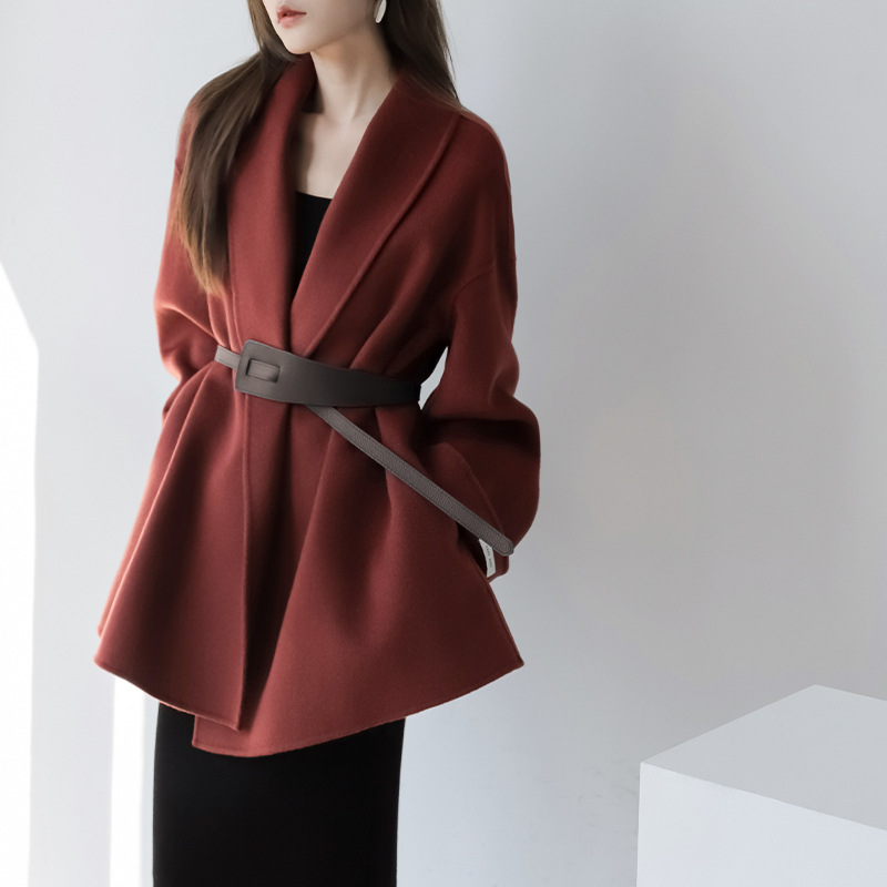 Áo len cashmere hai mặt nhỏ số lượng cao của phụ nữ có chiều dài vừa phải thắt lưng thắt lưng hình bóng áo khoác len