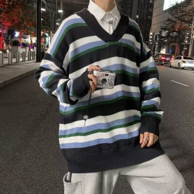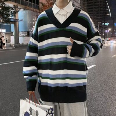 Áo len cổ điển lười Nhật Bản mùa xuân và mùa thu mới sang trọng phiên bản Hàn Quốc dáng rộng áo len cổ chữ V sọc xanh dương tay dài nam