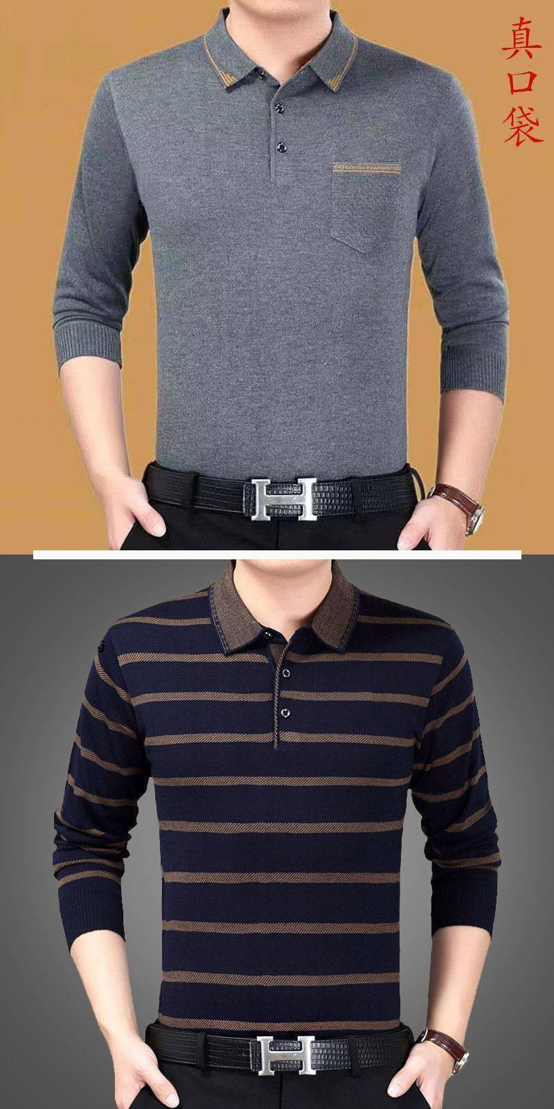 Áo len dệt kim dài tay mùa thu áo sơ mi nam có ve áo của người cha trung niên rộng rãi quần áo mùa thu giản dị có đáy áo sơ mi nam quần áo trung niên và người cao tuổi