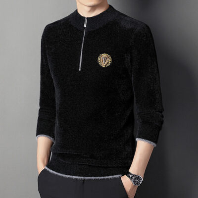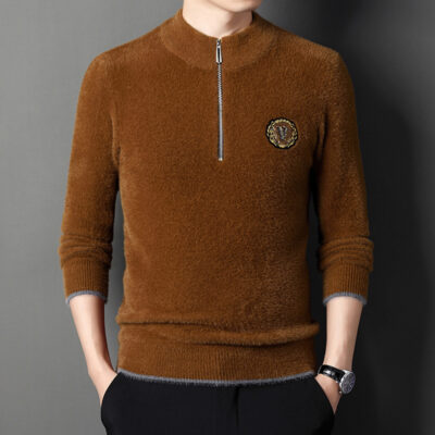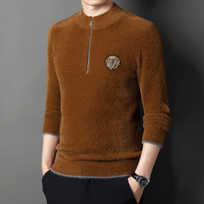 Áo len dệt kim dài tay nam mùa thu đông giả chồn áo sơ mi dây kéo cổ tròn Plus nhung dày ấm áp đáy áo sơ mi