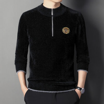 Áo len dệt kim dài tay nam mùa thu đông giả chồn áo sơ mi dây kéo cổ tròn Plus nhung dày ấm áp đáy áo sơ mi