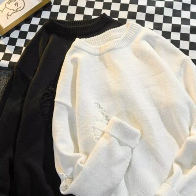 Áo len gió lười cổ tròn xé toạc nam mùa thu đông phong cách Hồng Kông dài tay màu trơn áo len dáng rộng thương hiệu thời trang