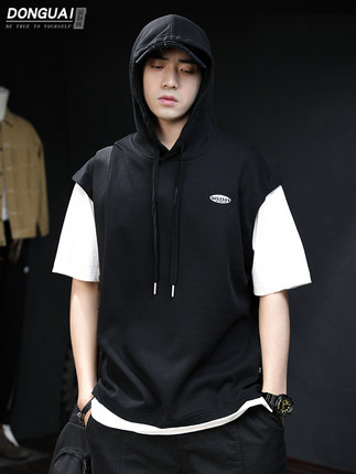 Áo len ngắn tay nam có mũ trùm đầu áo len mỏng mùa hè phần triều nhãn hiệu lỏng lẻo hạng nặng quốc triều giả hai mảnh quần áo nam áo thun