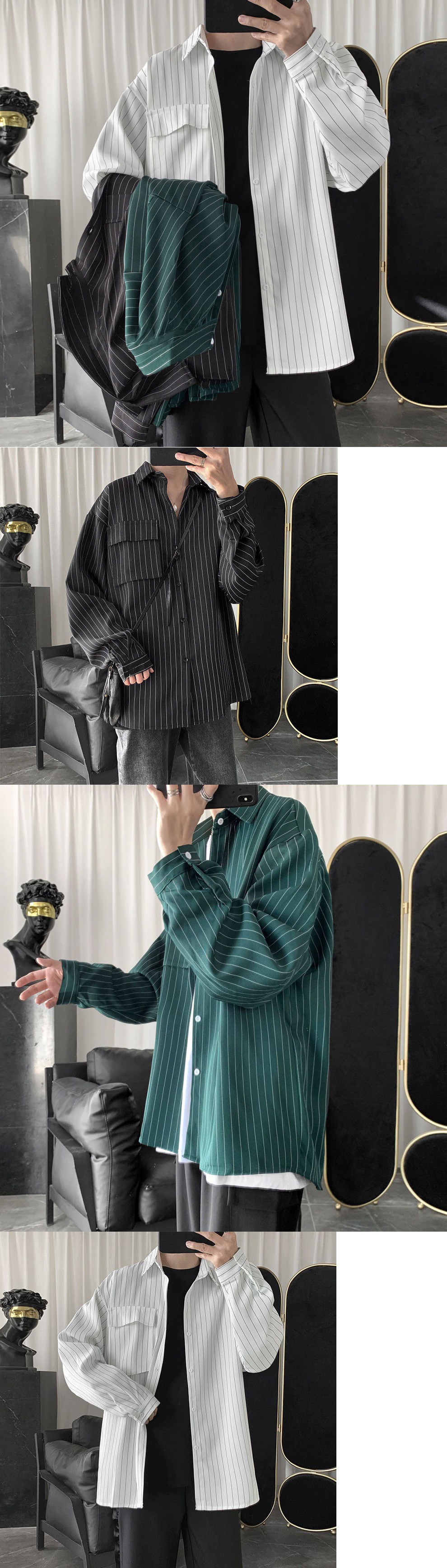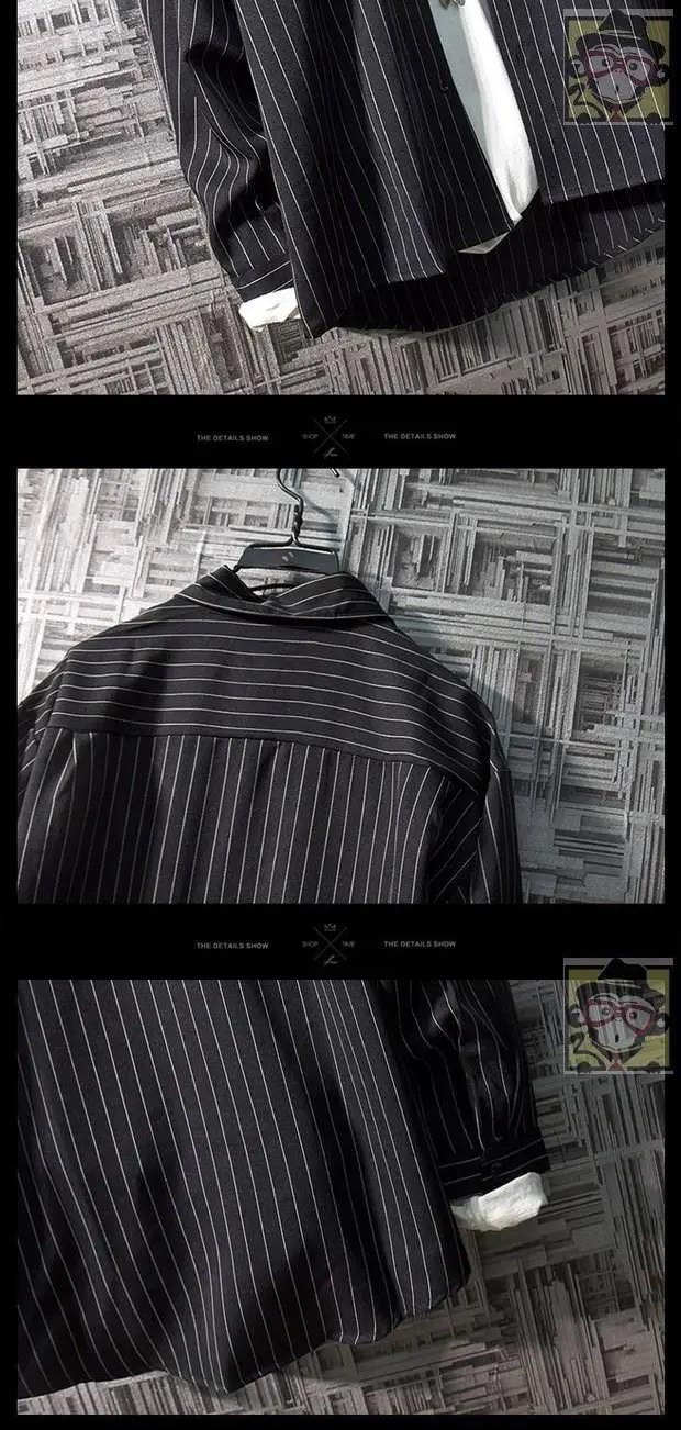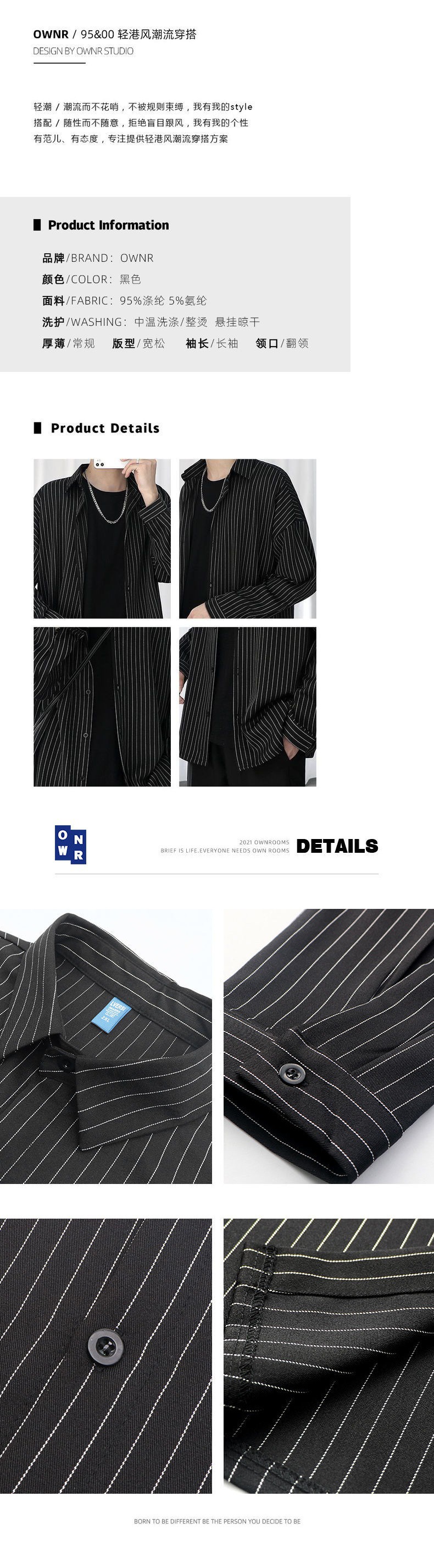 Áo sơ mi áo khoác nam sọc Hồng Kông phong cách Nhật Bản thường ngày quần áo rộng màu đen áo sơ mi nam dài tay mùa thu mỏng