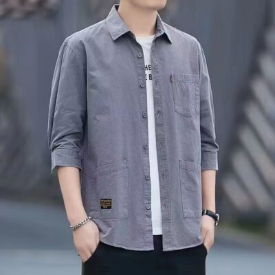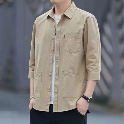 Áo sơ mi cotton nguyên chất mùa xuân và mùa hè cho nam sơ mi rộng tay dài tay áo ba phần tư giản dị của nam được xử lý không ủi cotton nguyên chất tại chỗ
