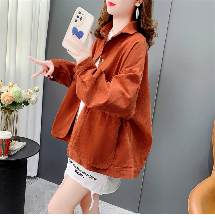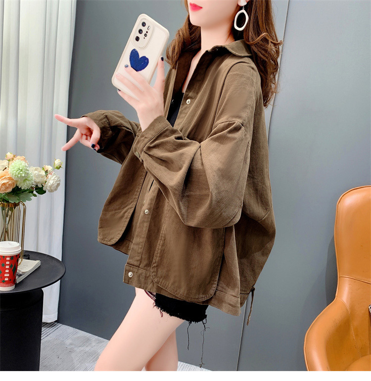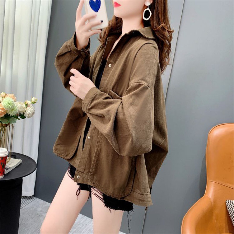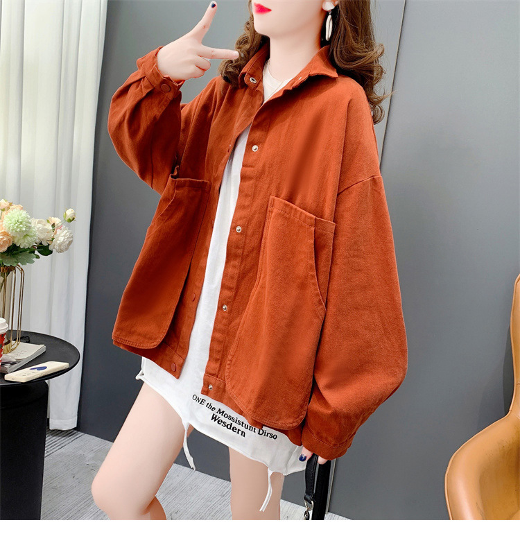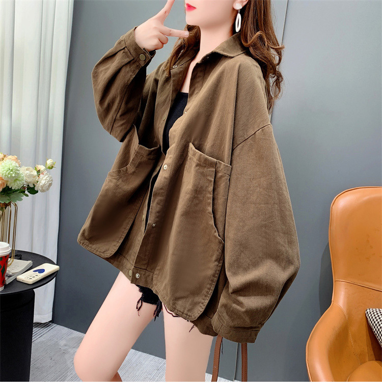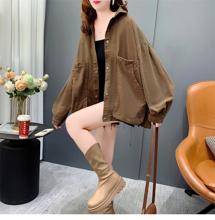 Áo sơ mi denim ngắn túi lớn áo khoác nữ mùa thu 2023 mới dáng rộng lười gió áo khoác đa năng