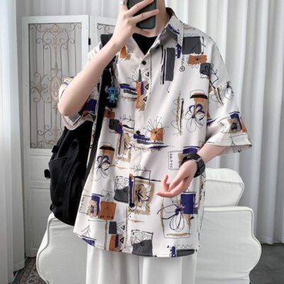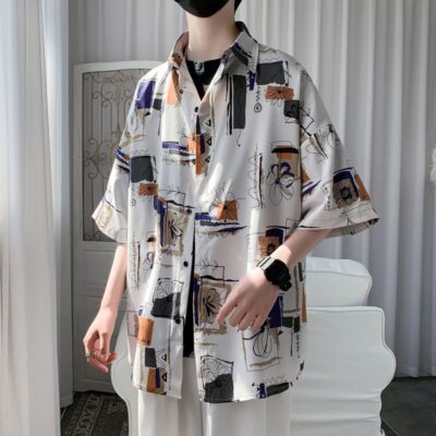 Áo sơ mi hoa ngắn tay kiểu dáng cổ điển dành cho nam và nữ mùa hè băng lụa in phong cách Hồng Kông thô lỗ đẹp trai nửa tay rời đi biển áo sơ mi áo khoác