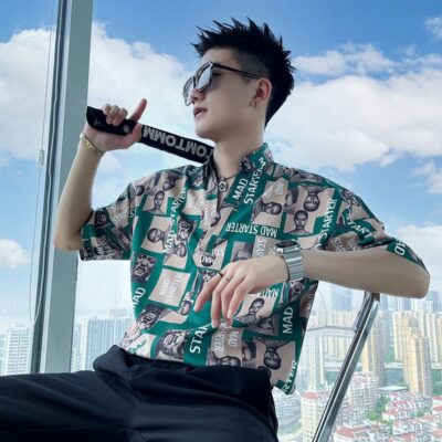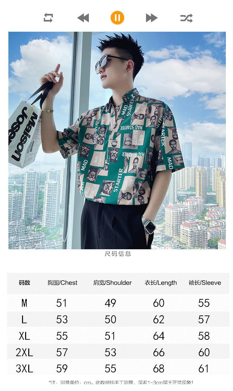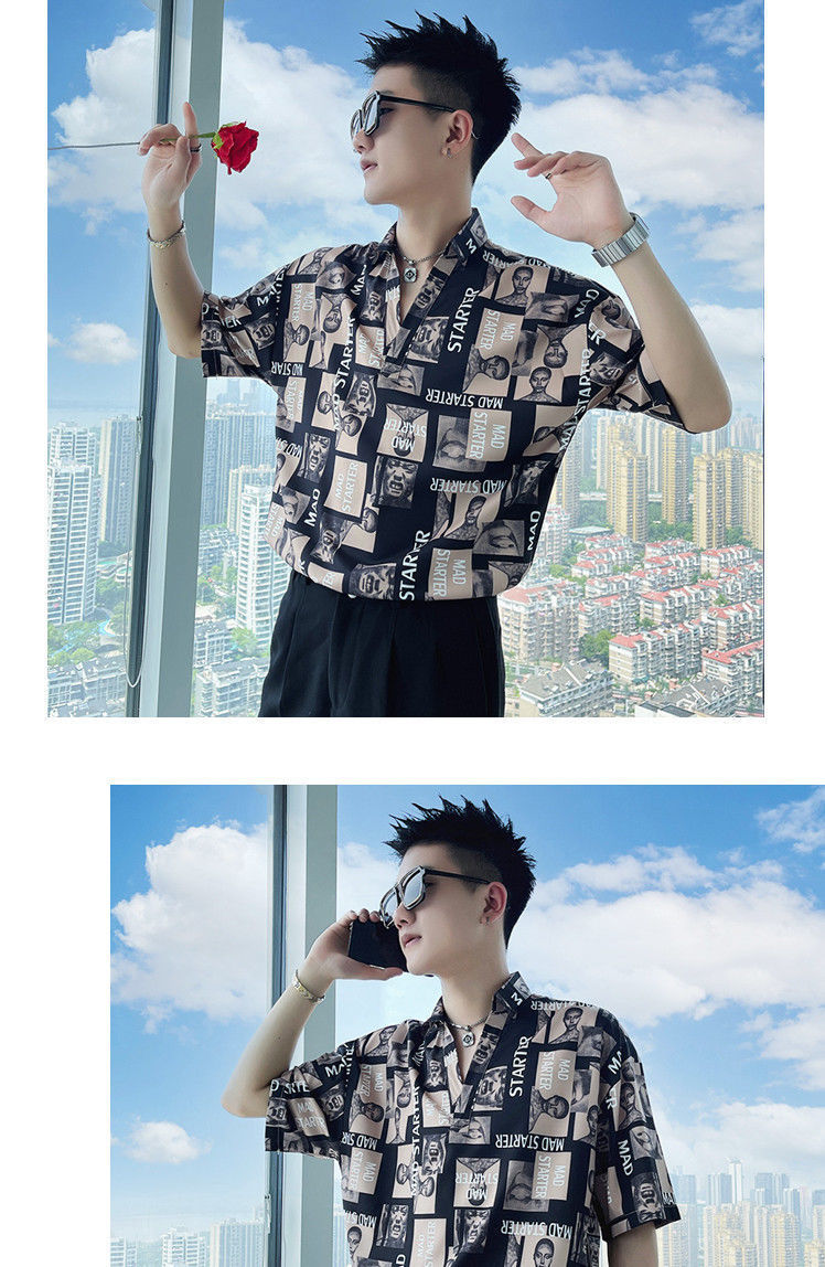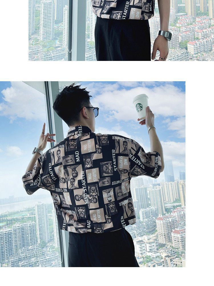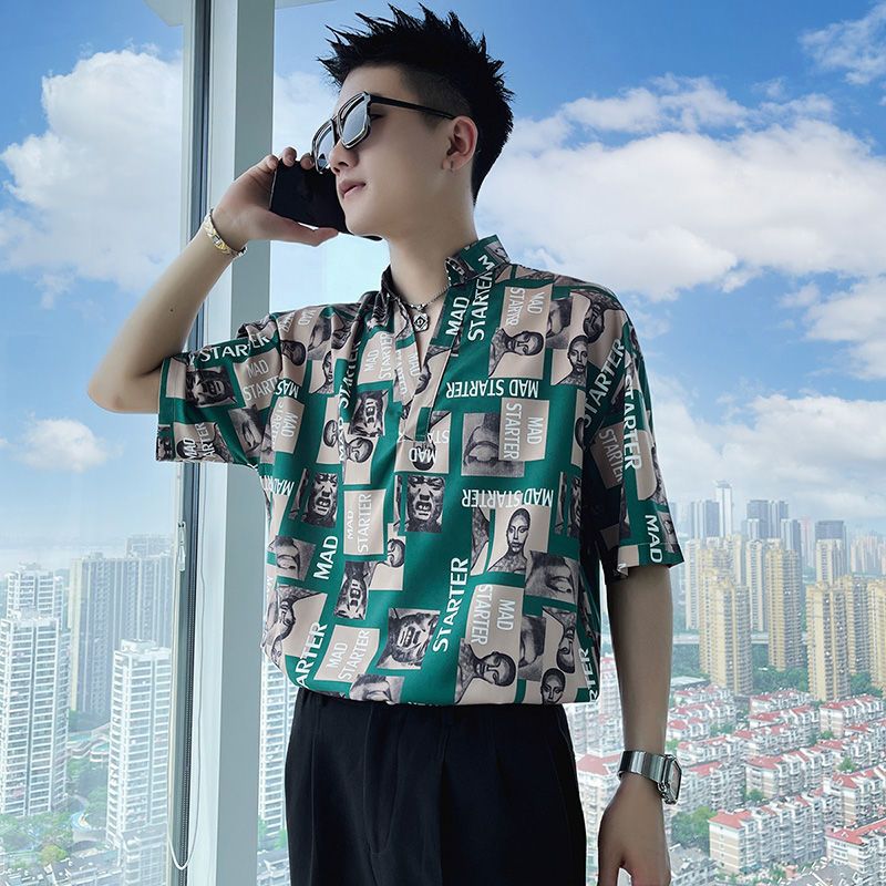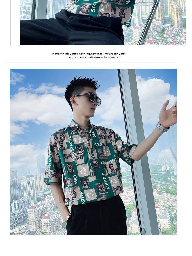 Áo sơ mi hoa ngắn tay mùa hè nhà tạo mẫu tóc nam thương hiệu hợp thời trang ins ruffian đẹp trai áo sơ mi tay ba phần tư ice lụa lưới áo thun đỏ
