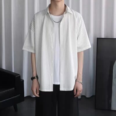 Áo sơ mi kẻ sọc mùa hè áo khoác nam phong cách Hồng Kông Nhật Bản quần áo phóng khoáng phiên bản Hàn Quốc xu hướng áo sơ mi nam ngắn tay mùa hè