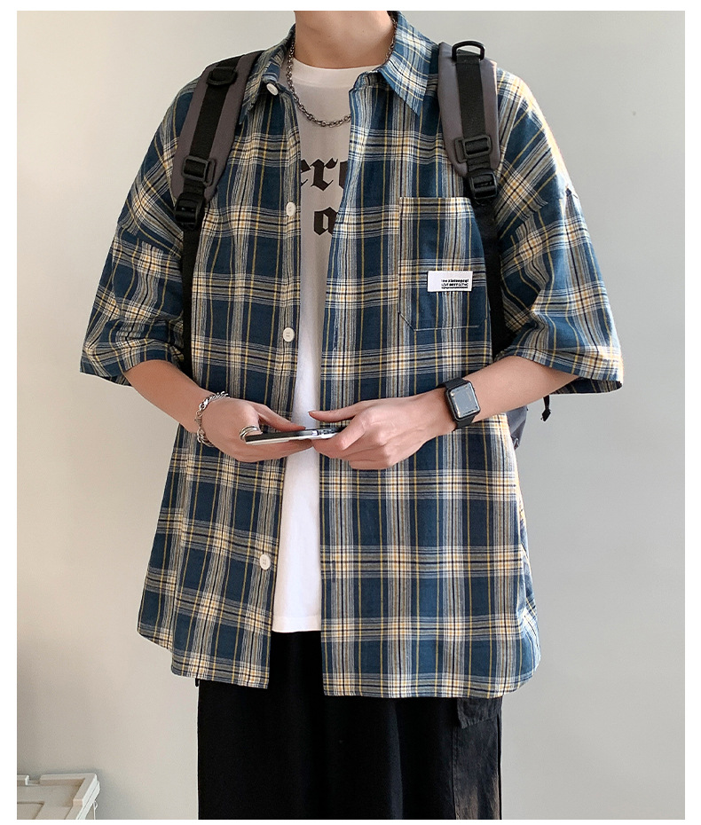 Áo sơ mi kẻ sọc mùa hè mới cho nam sơ mi ngắn tay giản dị thương hiệu hợp thời trang áo tay dài năm phần tư Áo khoác nam phong cách Hồng Kông inch