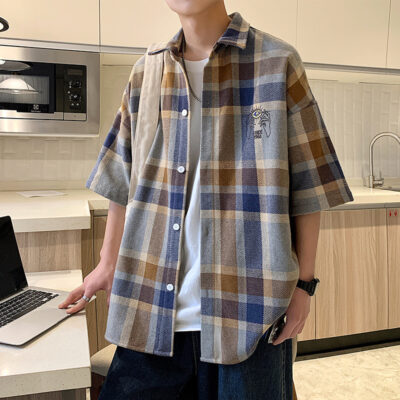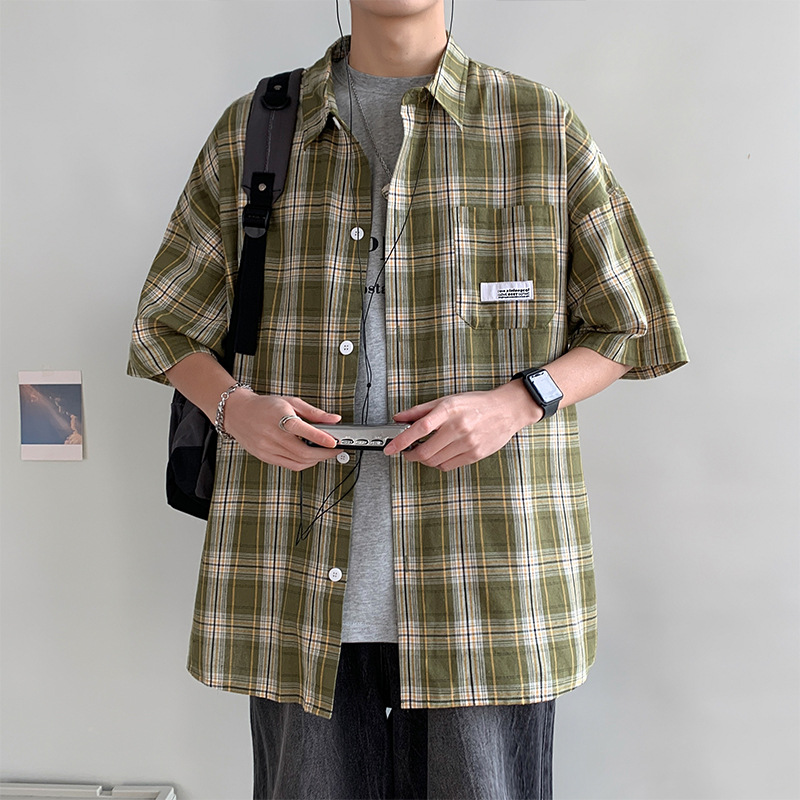 Áo sơ mi kẻ sọc mùa hè mới cho nam sơ mi ngắn tay giản dị thương hiệu hợp thời trang áo tay dài năm phần tư Áo khoác nam phong cách Hồng Kông inch