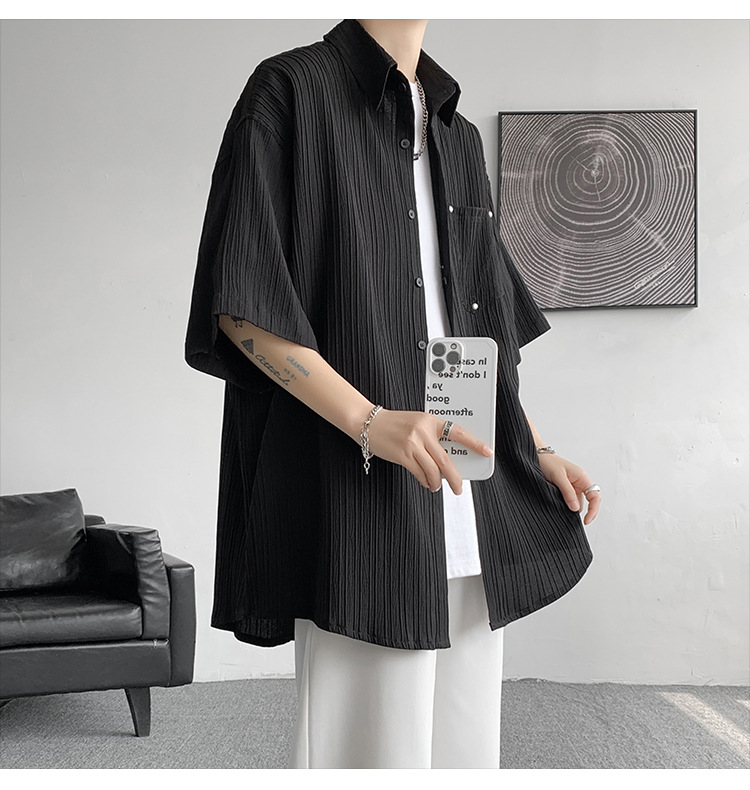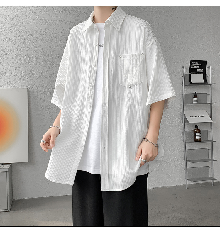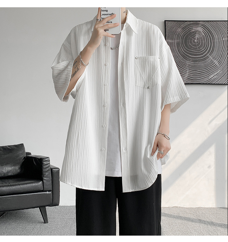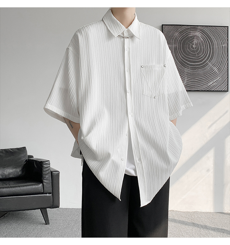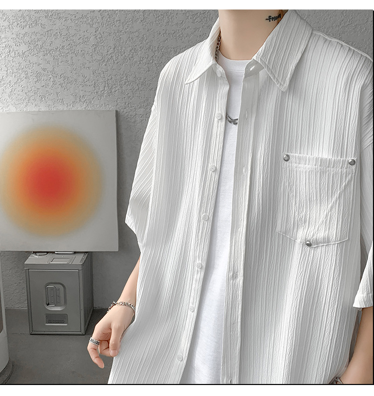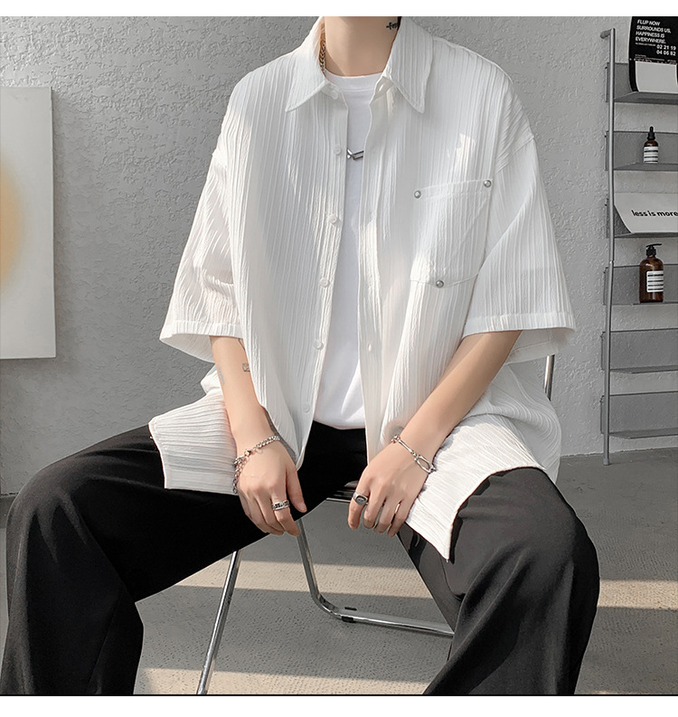 Áo sơ mi lụa băng trắng nam ngắn tay xếp nếp cảm giác thích hợp thiết kế áo khoác nam kẻ thô lỗ đẹp trai dụng cụ áo sơ mi tay năm phần tư