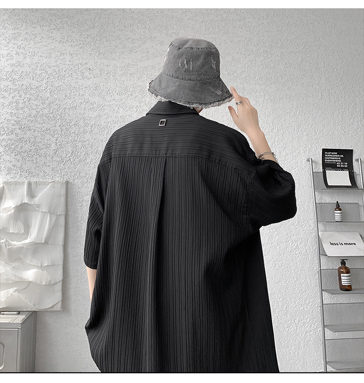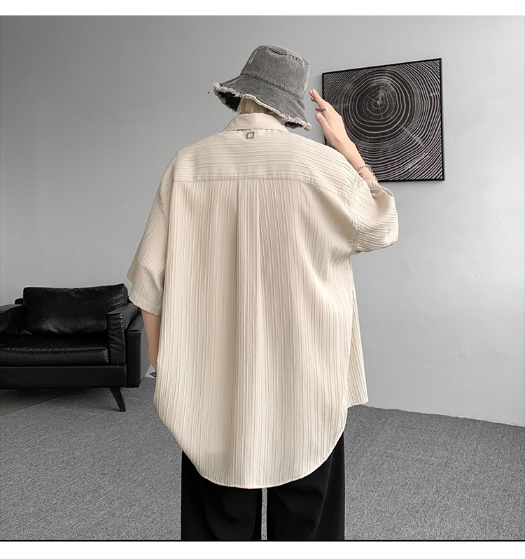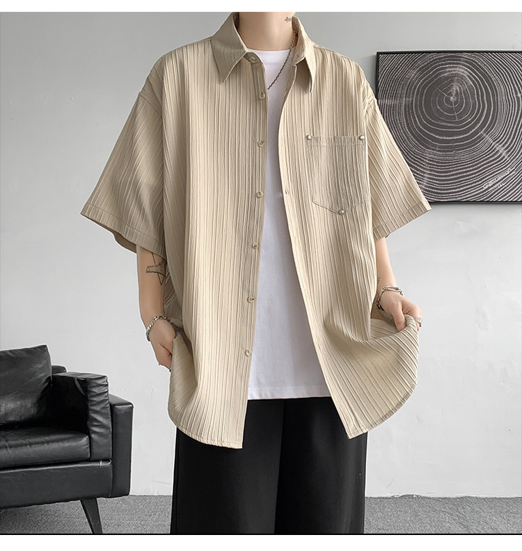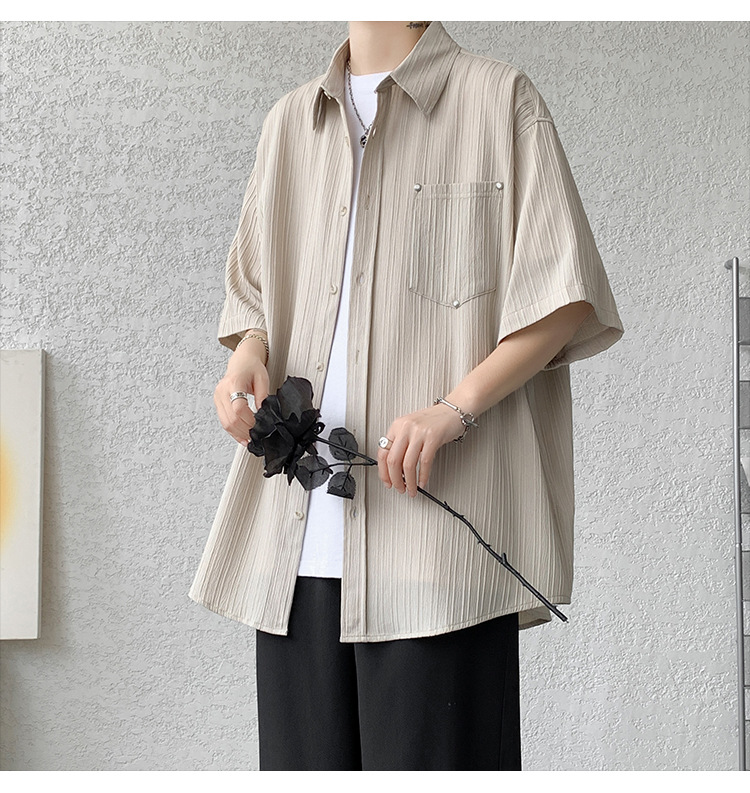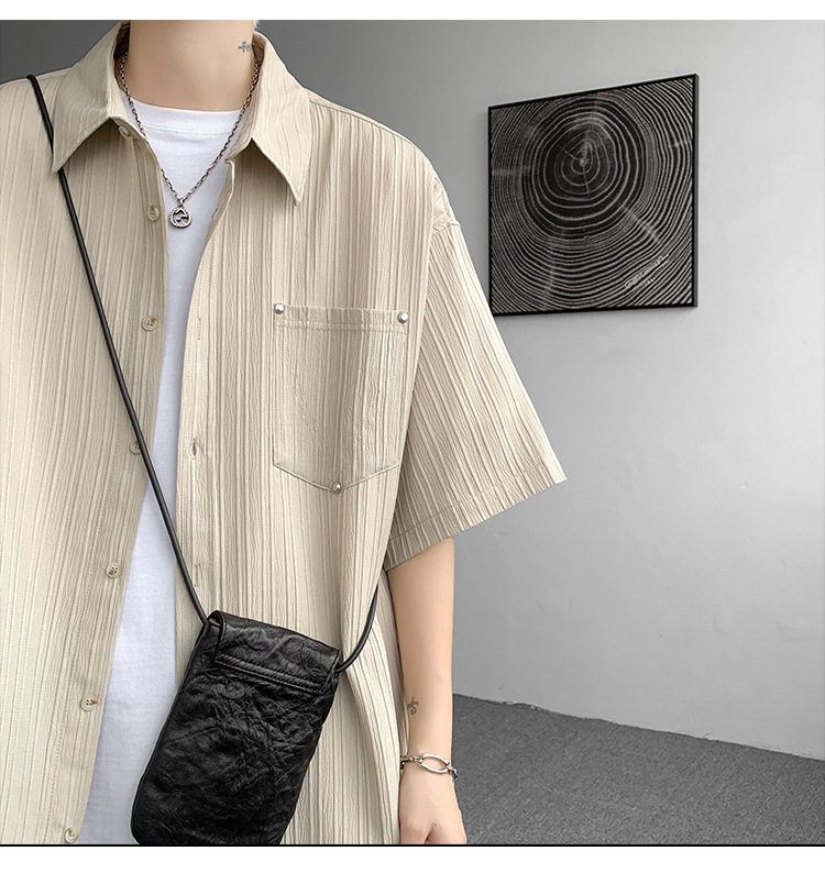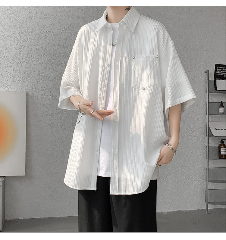 Áo sơ mi lụa băng trắng nam ngắn tay xếp nếp cảm giác thích hợp thiết kế áo khoác nam kẻ thô lỗ đẹp trai dụng cụ áo sơ mi tay năm phần tư