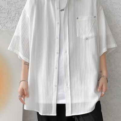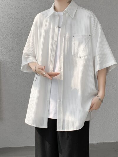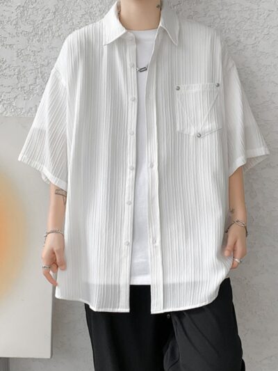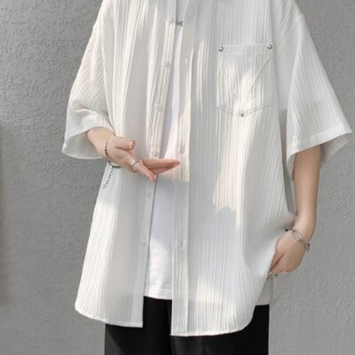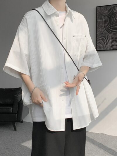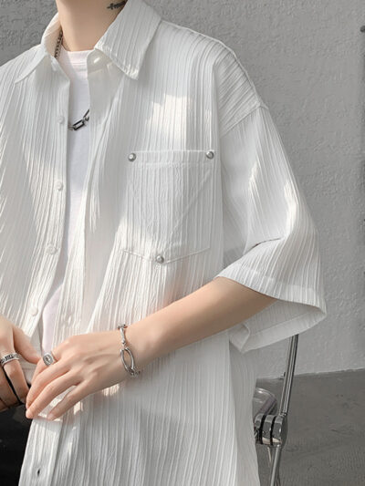 Áo sơ mi lụa băng trắng nam ngắn tay xếp nếp cảm giác thích hợp thiết kế áo khoác nam kẻ thô lỗ đẹp trai dụng cụ áo sơ mi tay năm phần tư