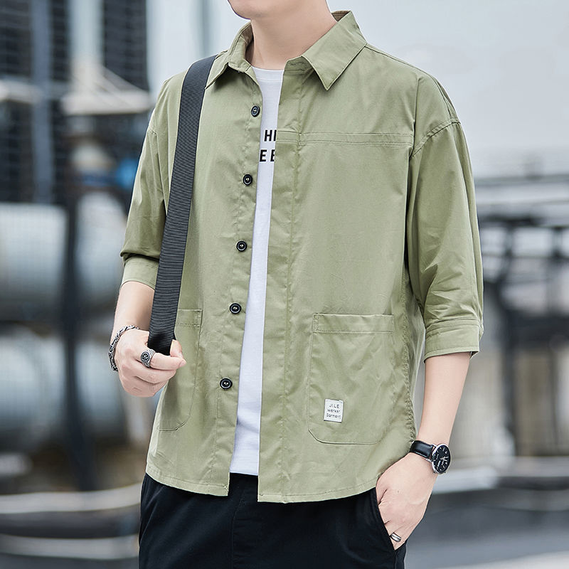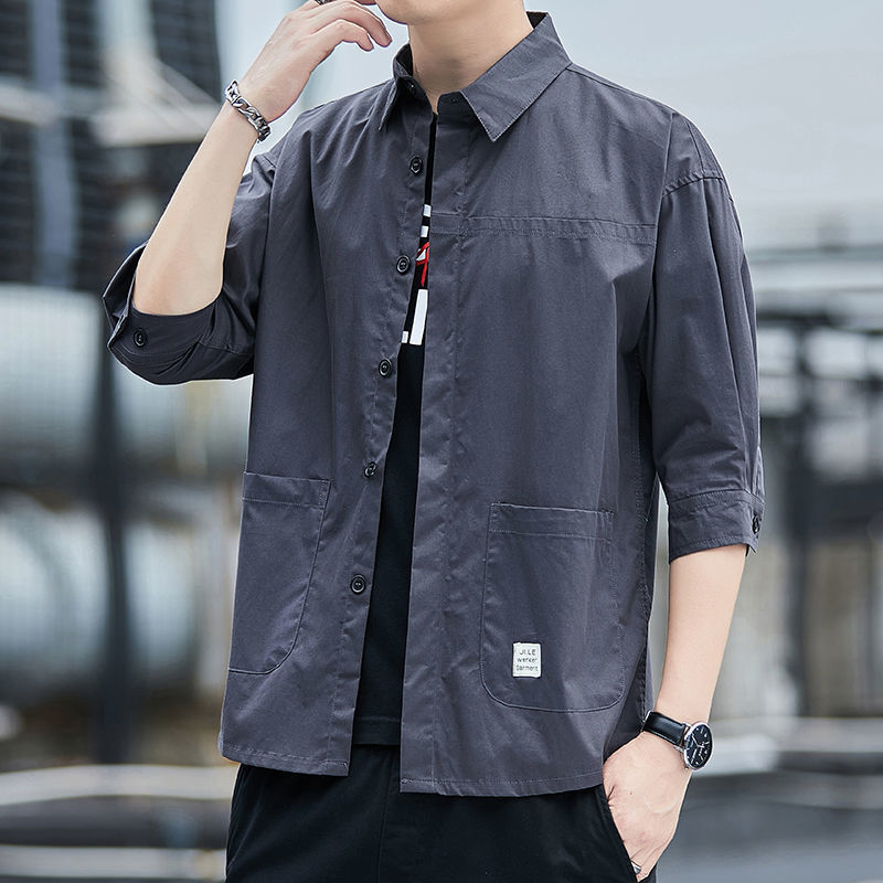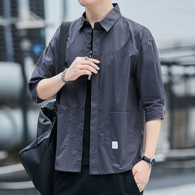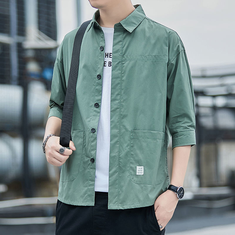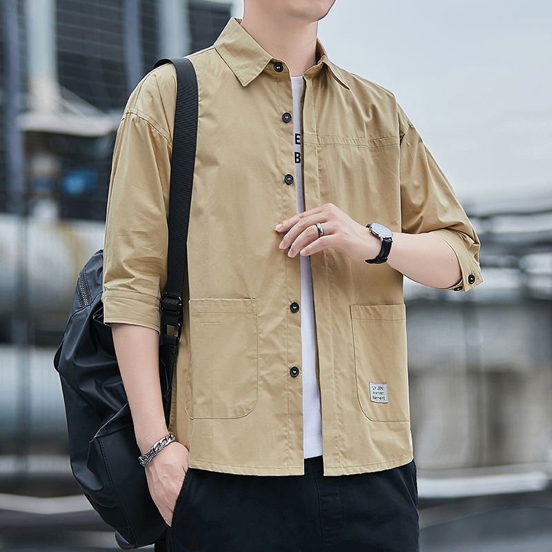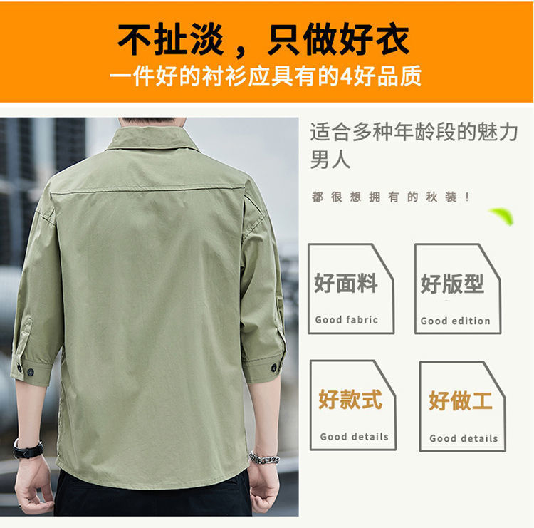 Áo sơ mi nam ba phần tư ngắn tay mùa hè phần mỏng hợp thời trang tất cả các trận đấu áo sơ mi cotton dáng rộng áo khoác dụng cụ