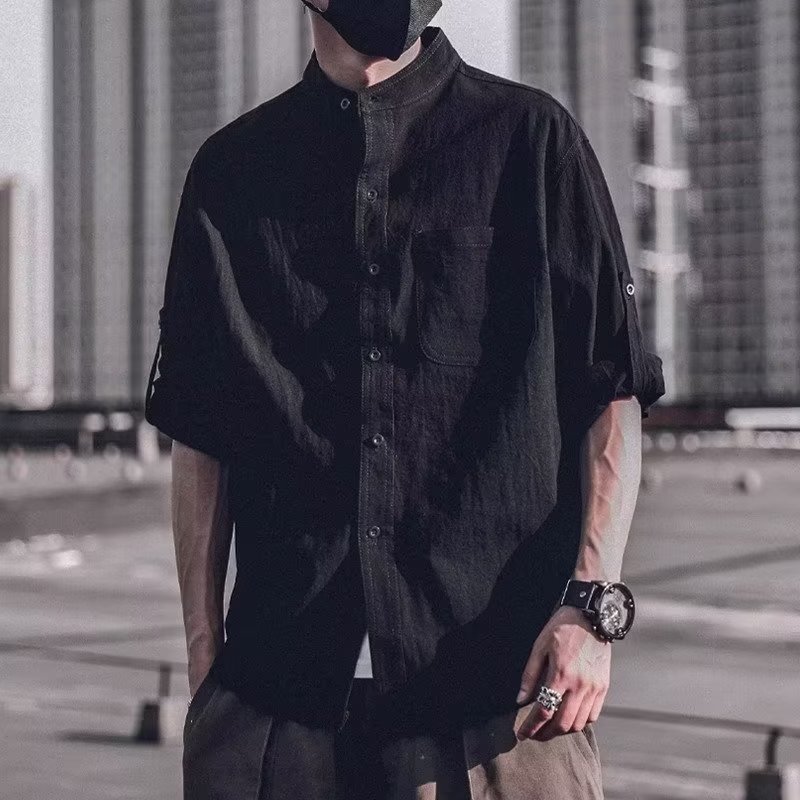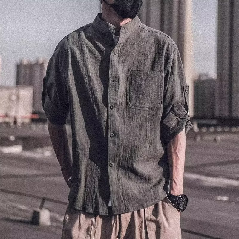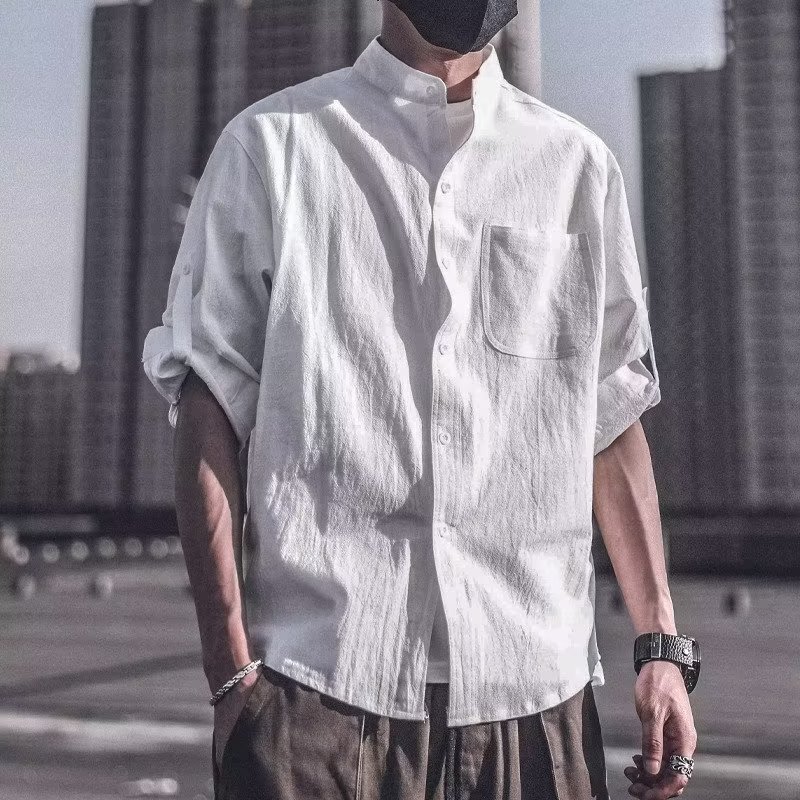 Áo sơ mi nam cổ điển cảm giác tuổi rộng rãi giản dị ba phần tư tay áo sơ mi phong cách Hồng Kông ins xu hướng thích hợp văn học thanh niên áo khoác