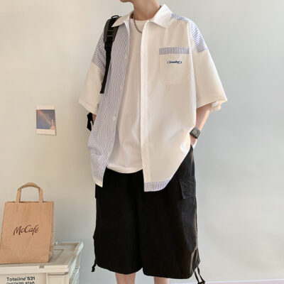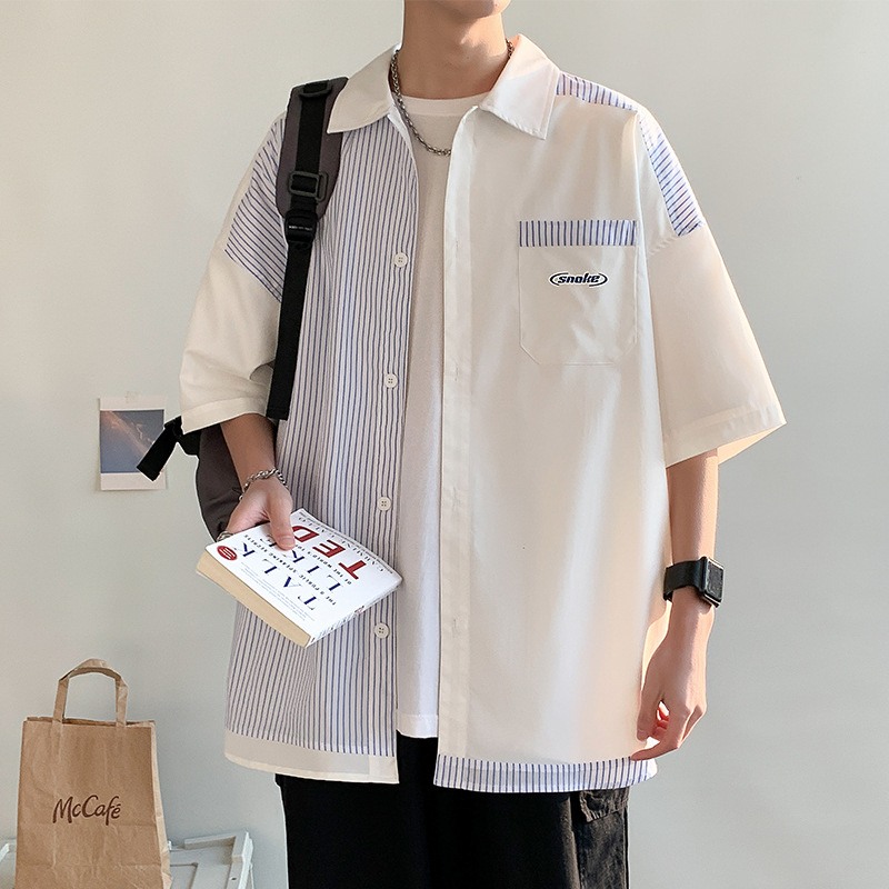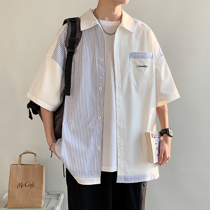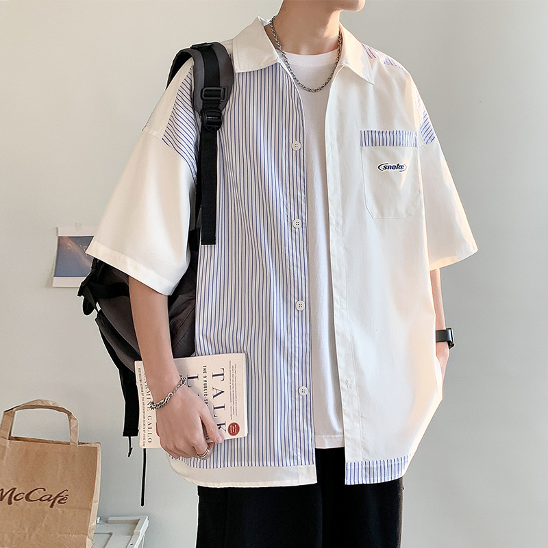 Áo sơ mi nam ngắn tay mùa hè 2023 mới cho nam giản dị nối dọc đường phố học sinh hợp thời trang áo sơ mi nửa tay áo khoác