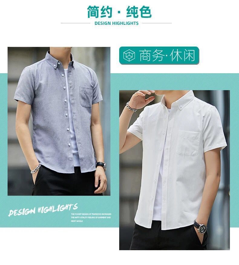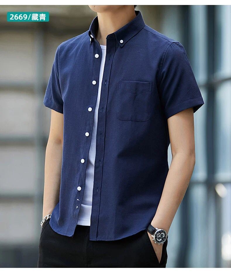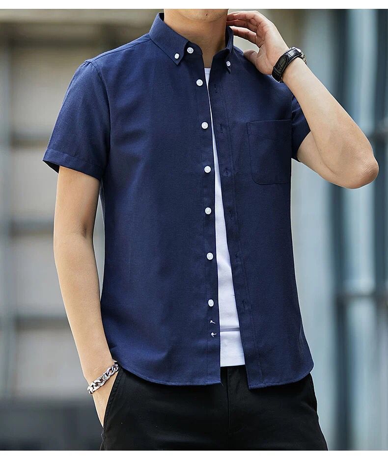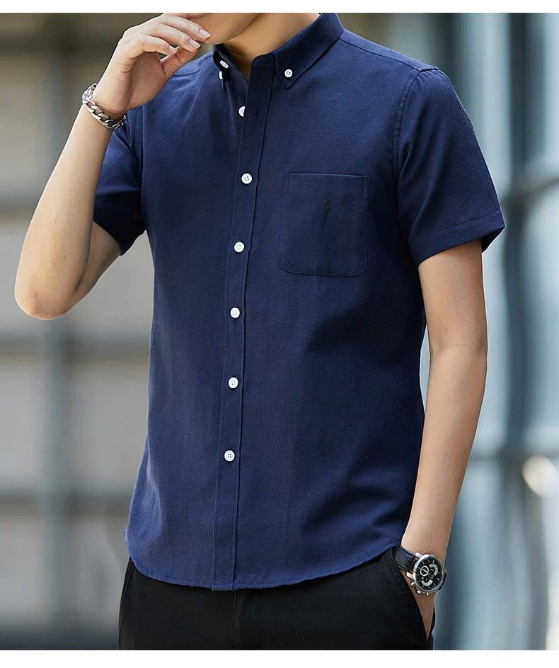 Áo sơ mi nam ngắn tay mùa hè Oxford quay nửa tay màu xanh hải quân áo sơ mi ôm vừa vặn màu trơn phần mỏng phiên bản thời trang của áo sơ mi Hàn Quốc