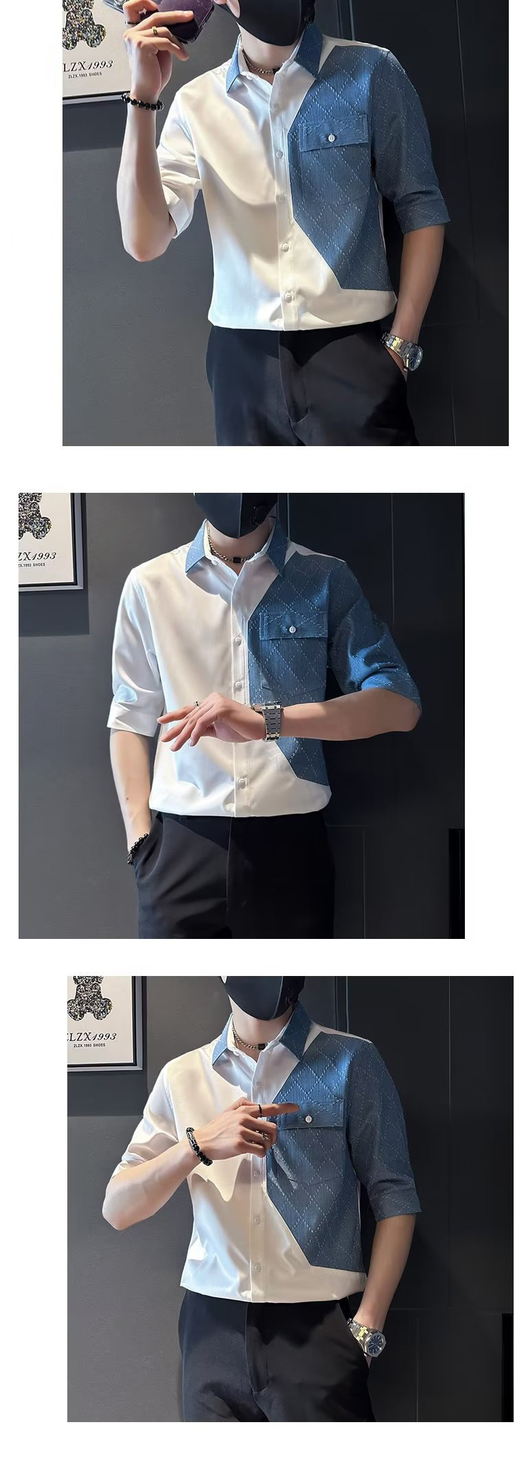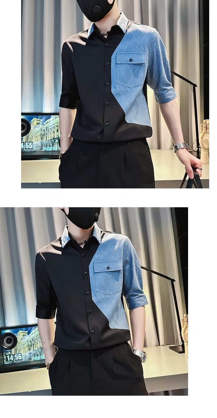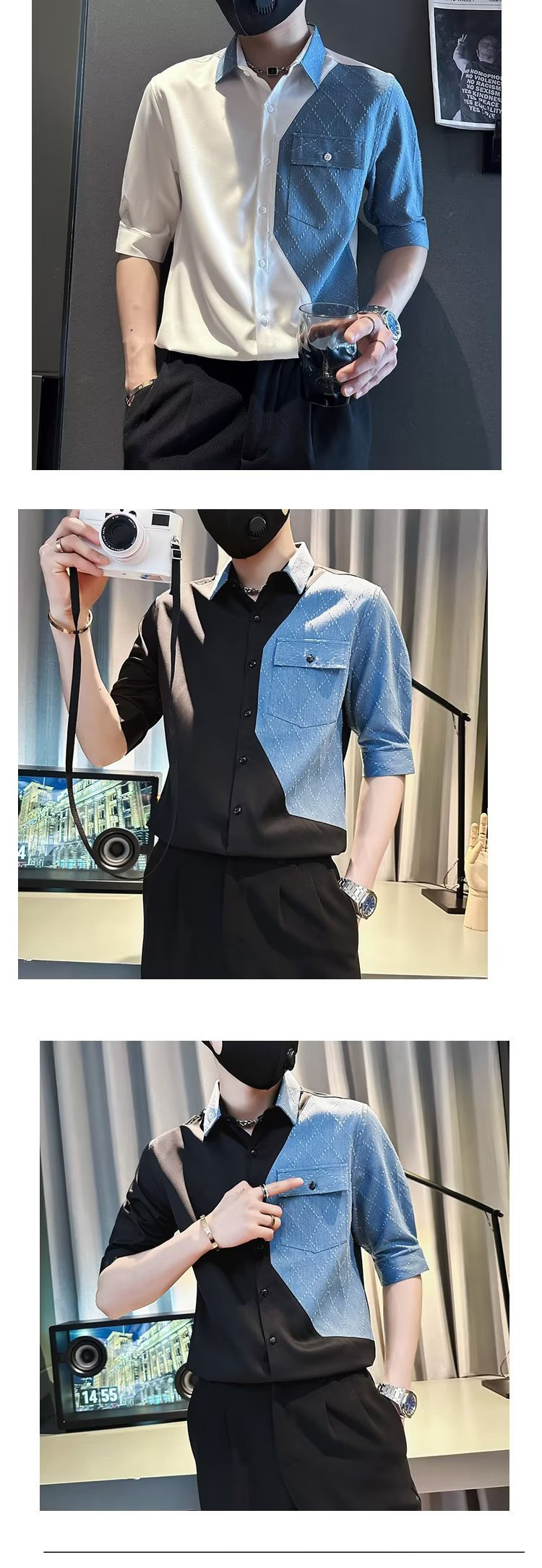 Áo sơ mi nam tay ngắn denim đường khâu 2023 new ruffian đẹp trai mùa hè nam thương hiệu hợp thời trang hàng đầu áo sơ mi tay năm phần tư áo sơ mi giản dị