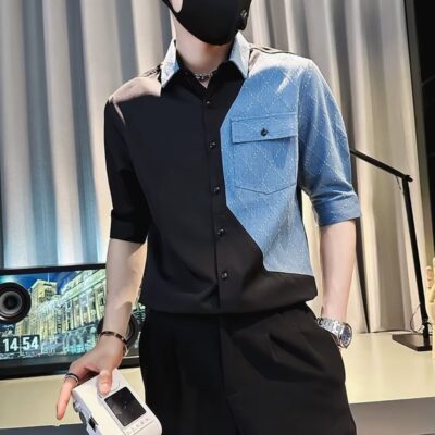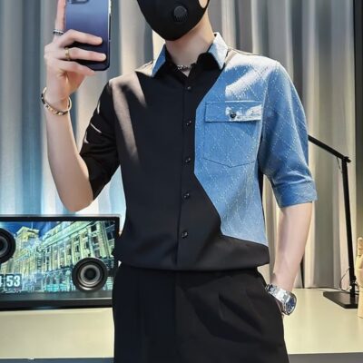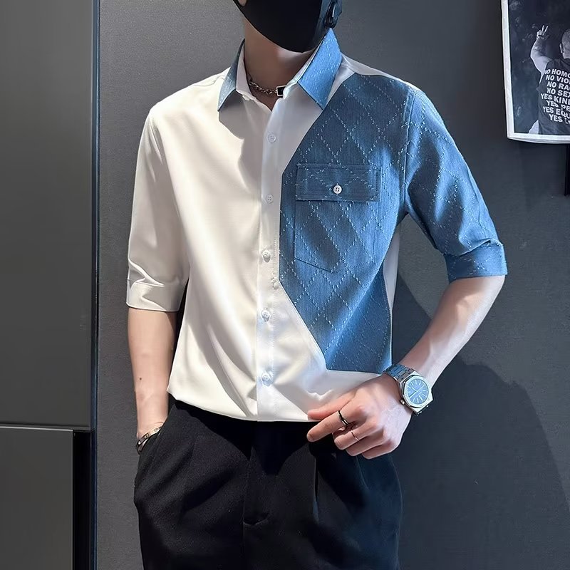 Áo sơ mi nam tay ngắn denim đường khâu 2023 new ruffian đẹp trai mùa hè nam thương hiệu hợp thời trang hàng đầu áo sơ mi tay năm phần tư áo sơ mi giản dị