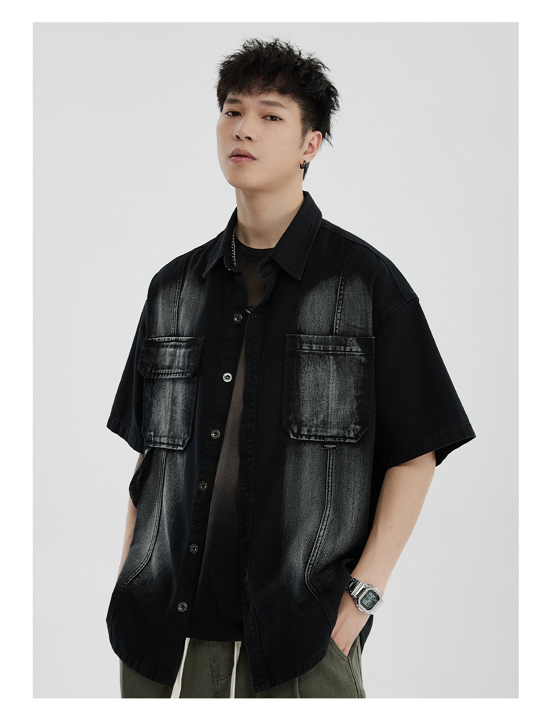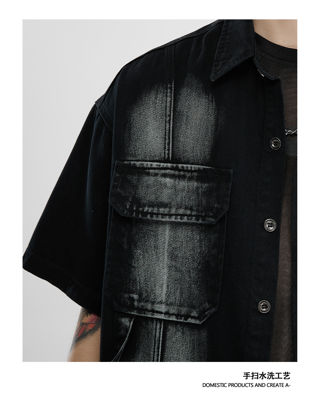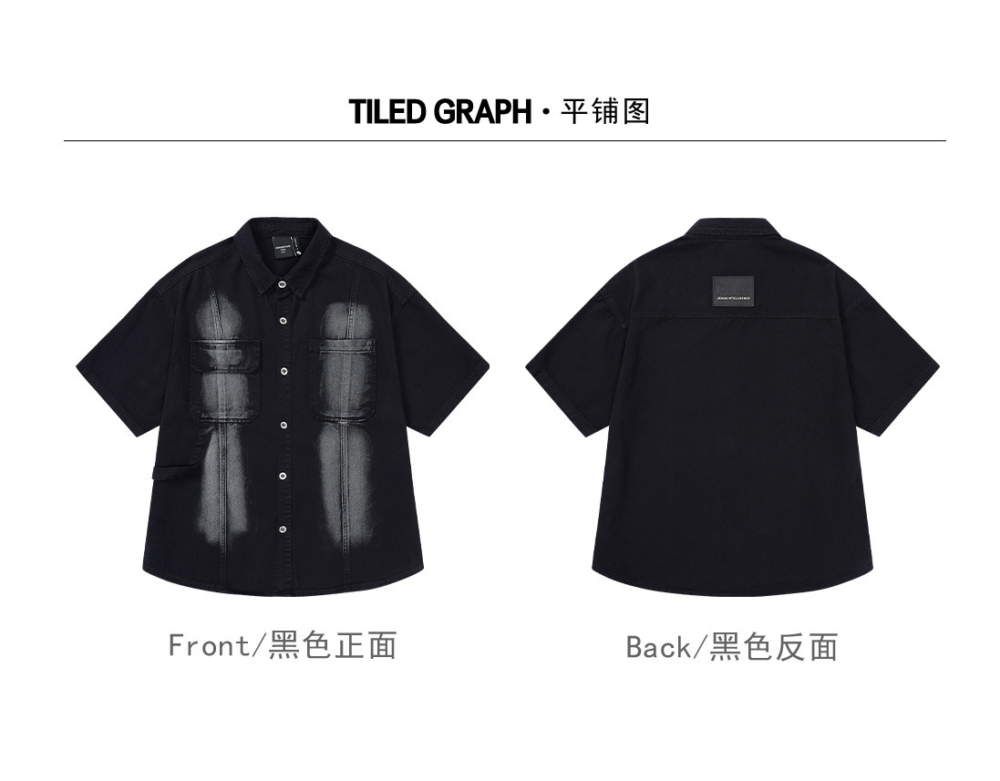Áo sơ mi phong cách dụng cụ ngắn tay áo khoác nam quần áo thời trang đã giặt cũ đuôi đơn giải phóng mặt bằng phong cách cổ điển của người đàn ông béo