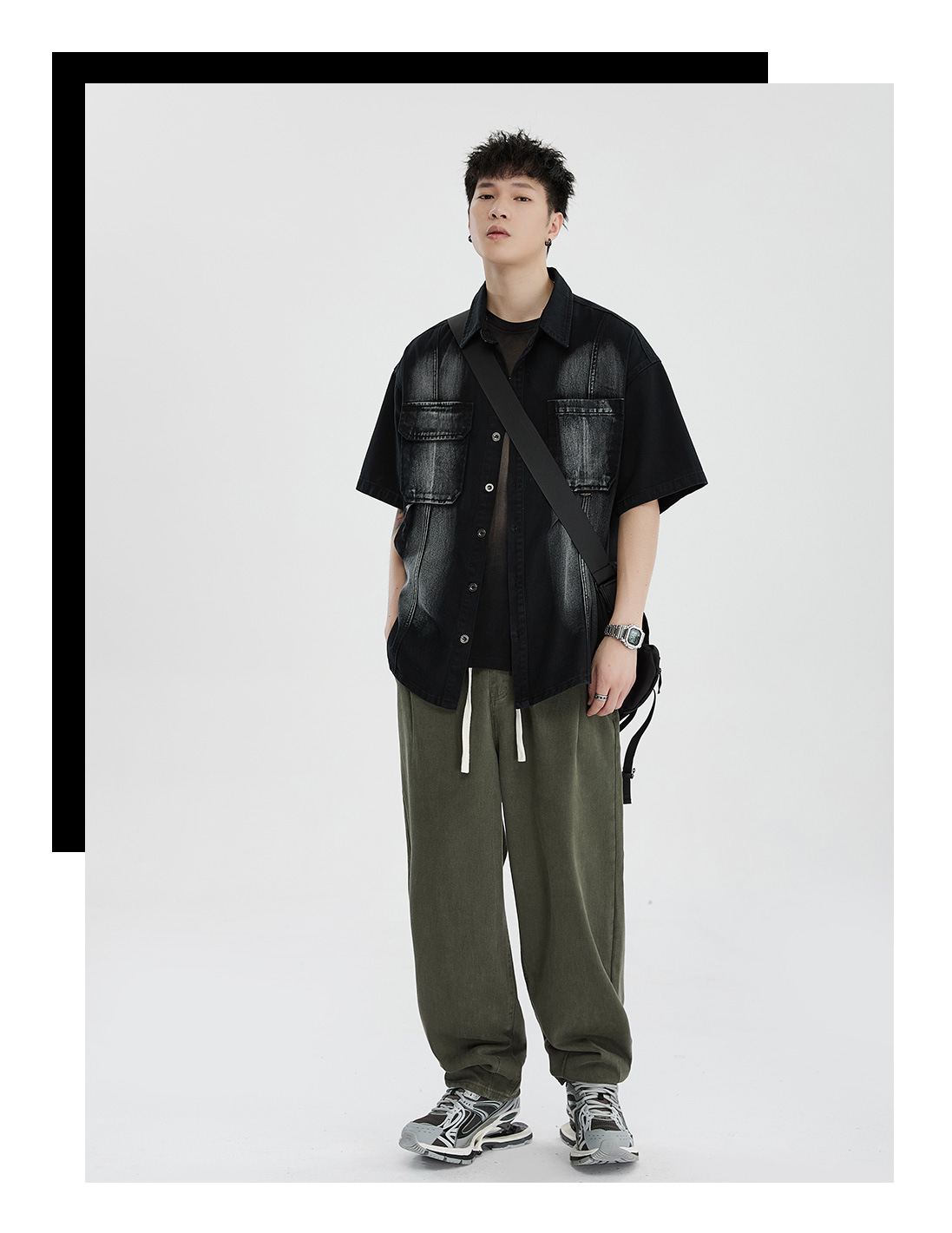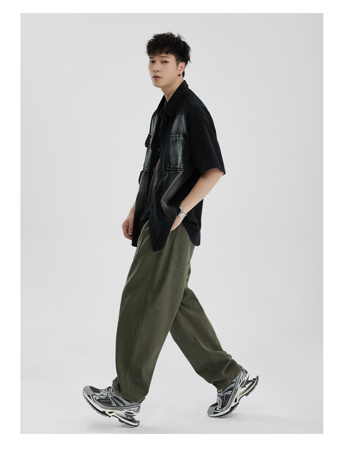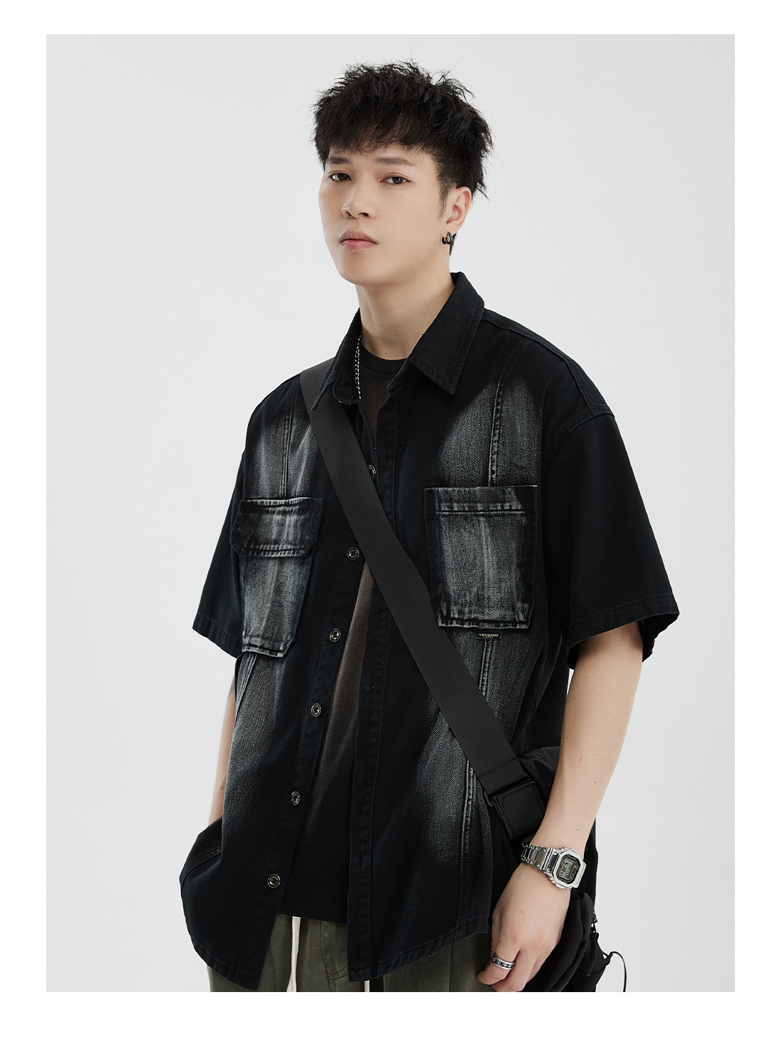 Áo sơ mi phong cách dụng cụ ngắn tay áo khoác nam quần áo thời trang đã giặt cũ đuôi đơn giải phóng mặt bằng phong cách cổ điển của người đàn ông béo