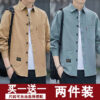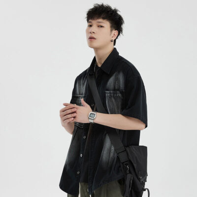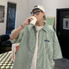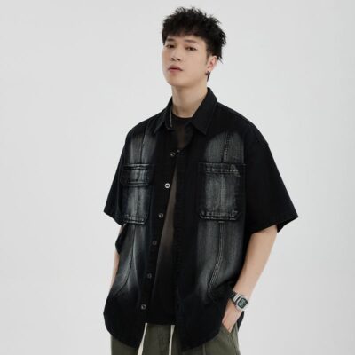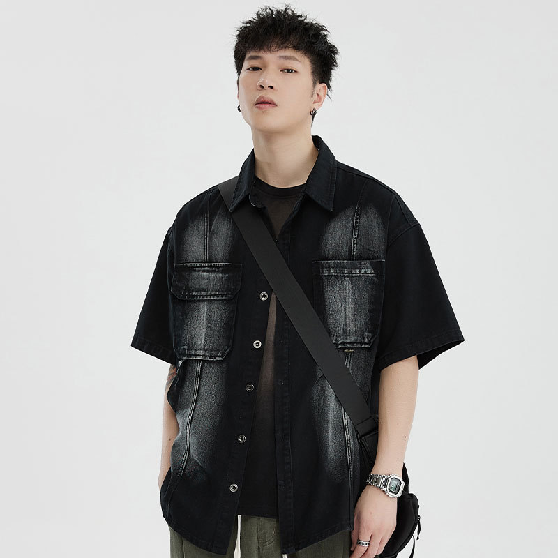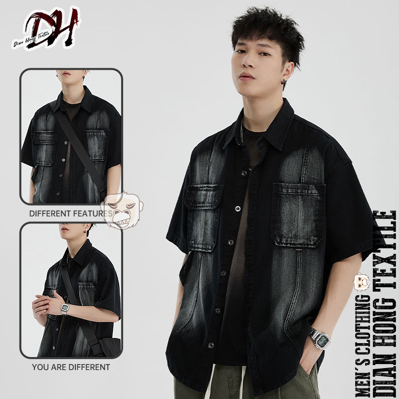 Áo sơ mi phong cách dụng cụ ngắn tay áo khoác nam quần áo thời trang đã giặt cũ đuôi đơn giải phóng mặt bằng phong cách cổ điển của người đàn ông béo