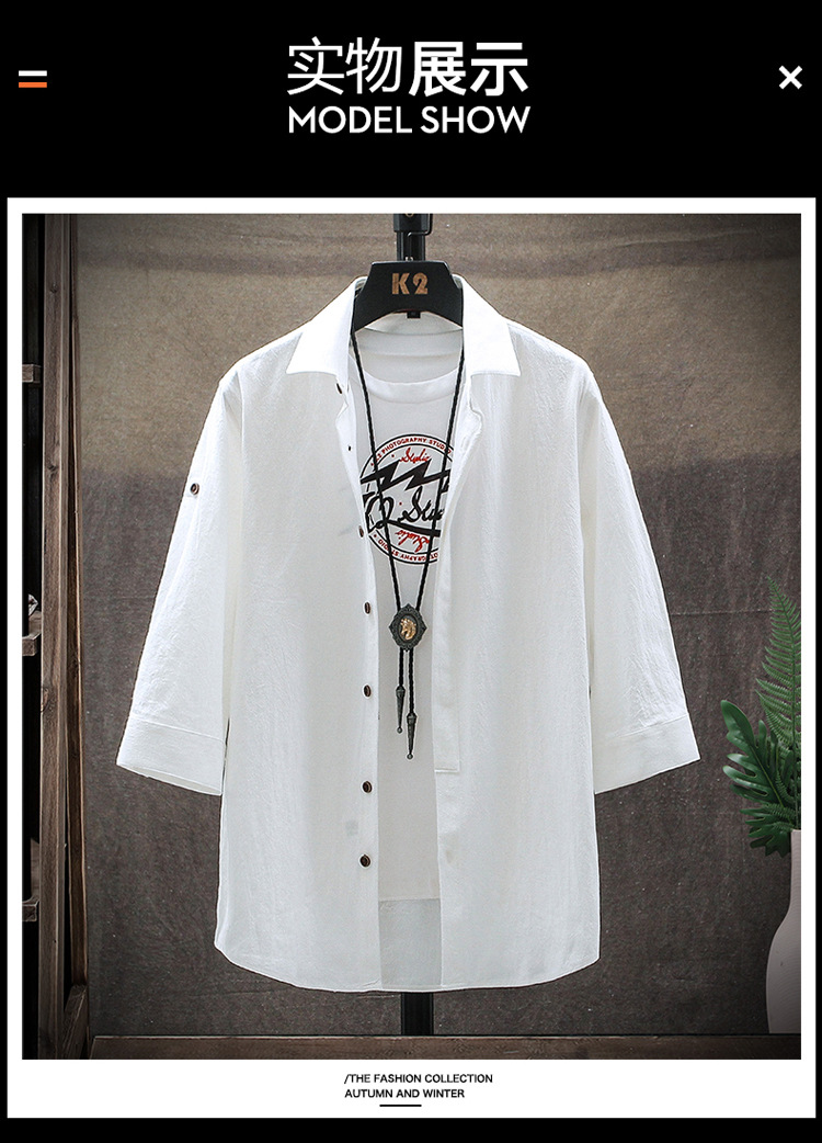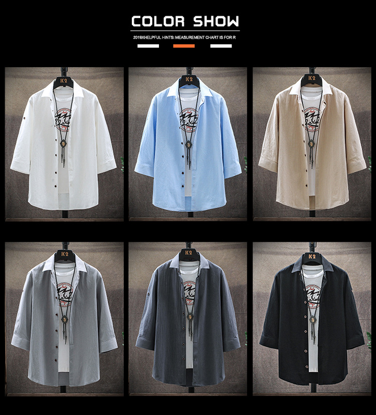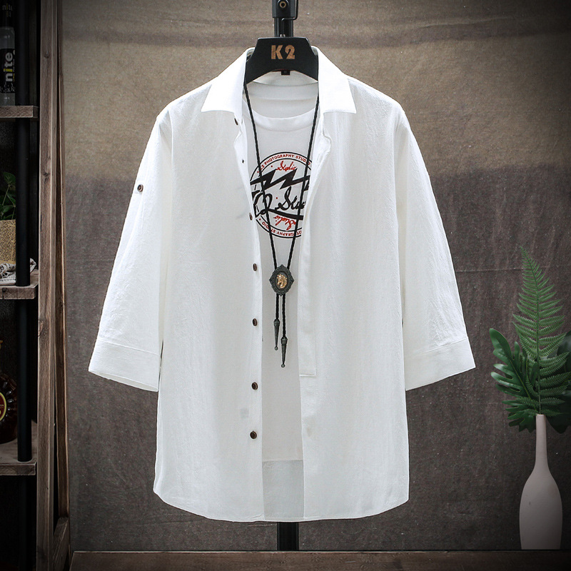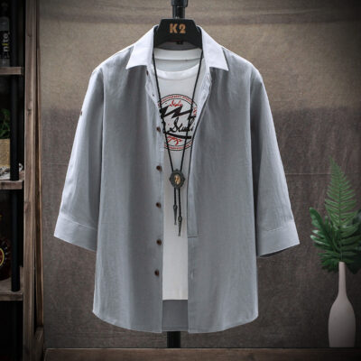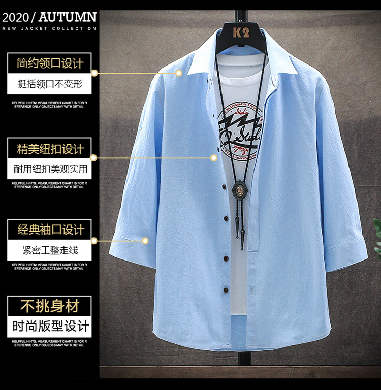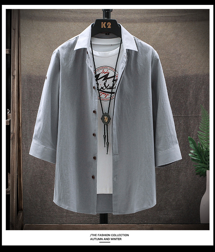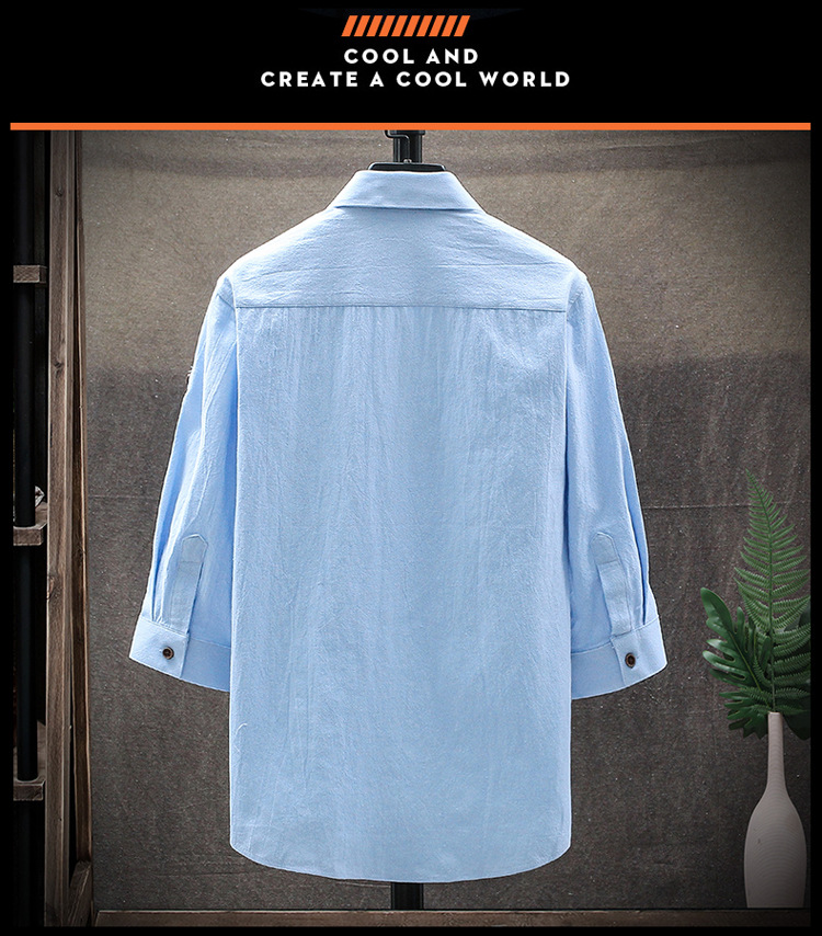 Áo sơ mi tay ba phần tư màu trơn thường ngày cho nam, quần áo cotton phù hợp với mọi lứa tuổi, màu xanh nhạt, tay áo năm phần tư, xu hướng mới mùa hè 2023