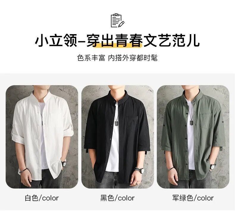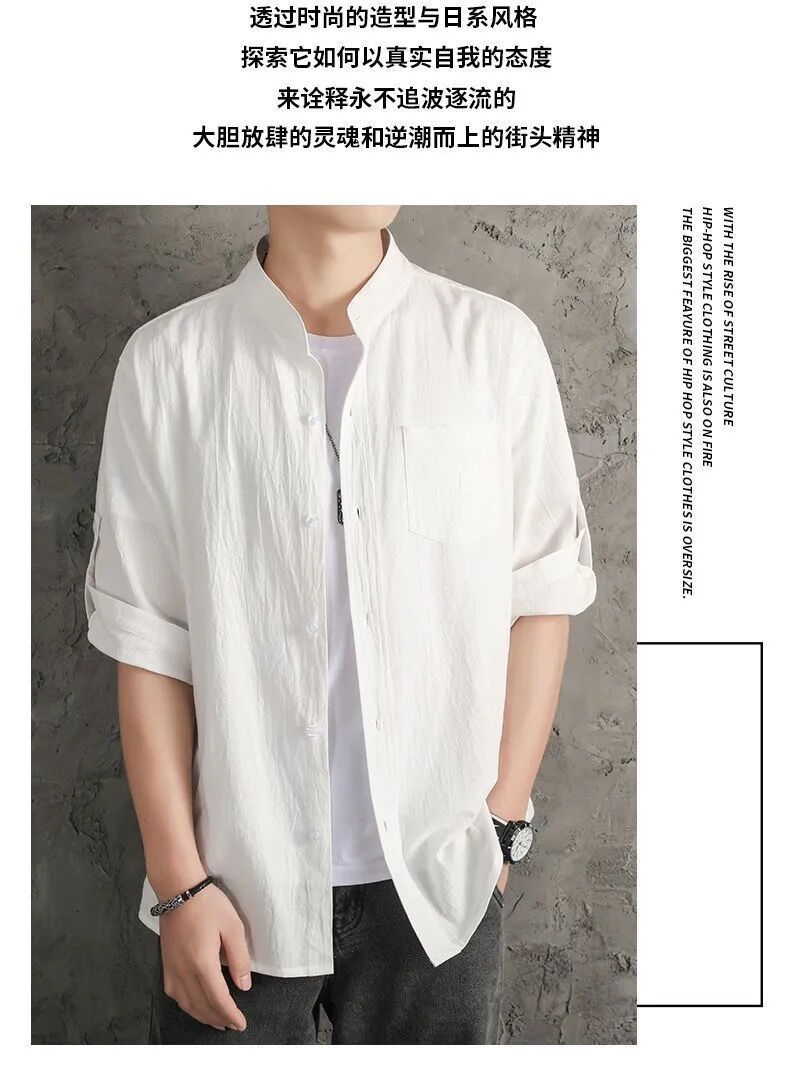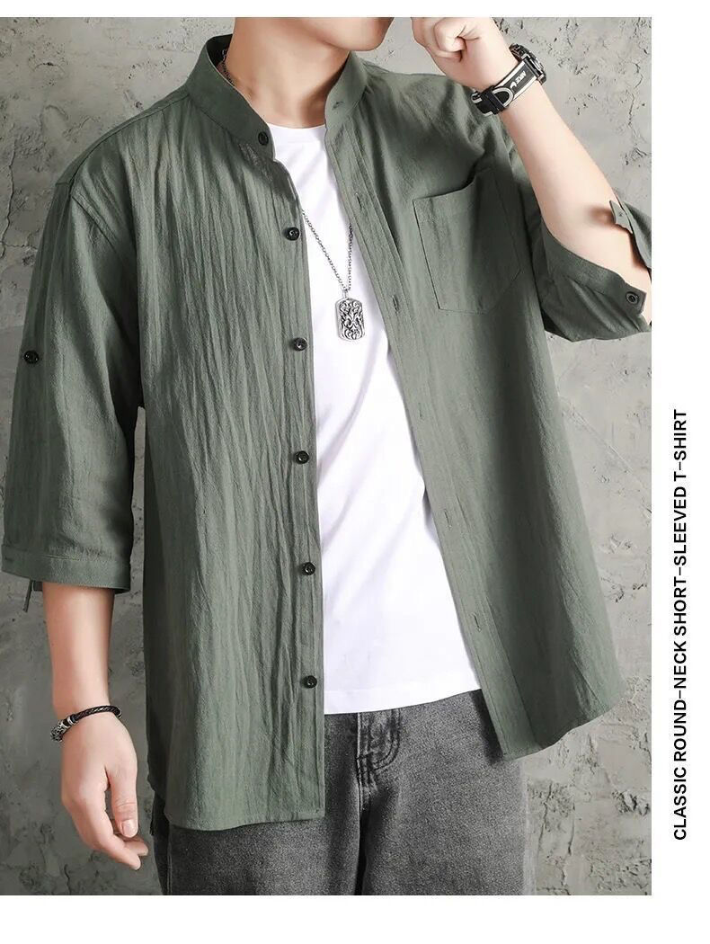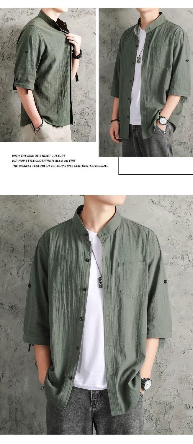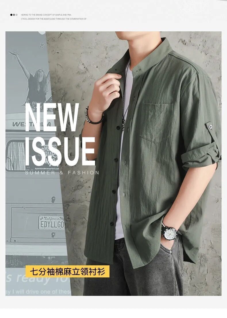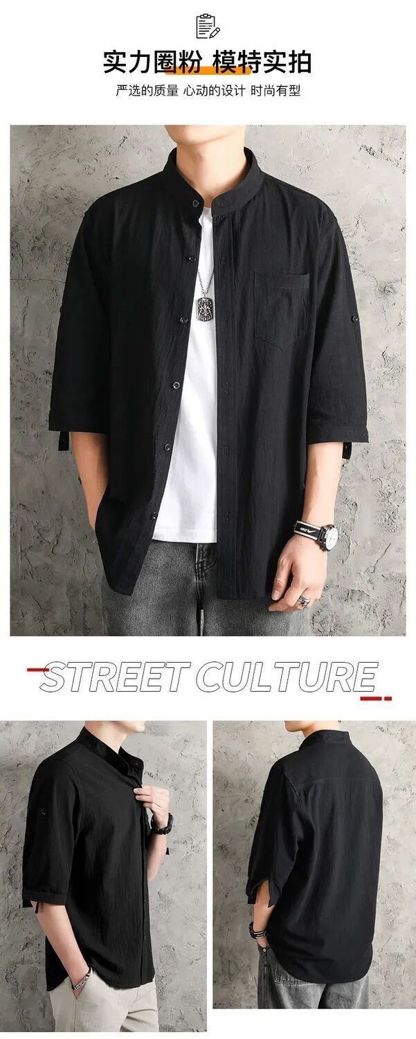 Áo sơ mi vải lanh Áo sơ mi nam Dáng rộng Plus Size Phong cách nam Tay ba phần tư Tay áo ba phần tư Áo cotton/cotton thường ngày cho nam