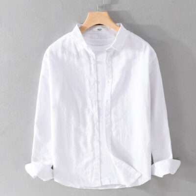 Áo sơ mi vải lanh nam dài tay giản dị có ve áo rộng trẻ trung màu trắng thoáng khí mềm vải lanh cotton sơ mi nam thời trang