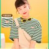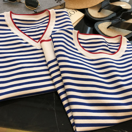 Áo thun tay ngắn sọc dành cho nữ 2022 Mùa hè thời trang mới áo thun cổ tròn lỏng lẻo Phần dệt kim nửa tay áo trên