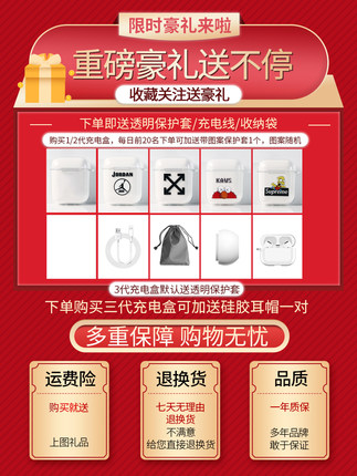 - 颜色分类: 【限时送豪礼】【备注二代三代】 AirPods充电盒【1/2代通用】【仅支持充电】 AirPods充电盒【1/2代通用】【支持充电+配对+电显】 AirPods Pro充电盒【3代使用】【支持充电+配对+电显】 【国行全新有线版】Airpods充电盒【1/2代通用】 【国行全新无线版】Airpods充电盒【1/2代通用】 【国行全新】AirpodsPro充电盒【仅适用Pro版本】 【国行全新】Airpods 3充电盒【仅适用新款3代版本】 国行全新AirPods 1代【左耳L】 国行全新AirPods 1代【右耳R】 国行全新AirPods 2代【左耳L】 国行全新AirPods 2代【右耳R】 国行全新AirPods Pro 【左耳L】 国行全新AirPods Pro 【右耳R】 国行全新新款AirPods 3代【左耳L】 国行全新新款AirPods 3代【右耳R】