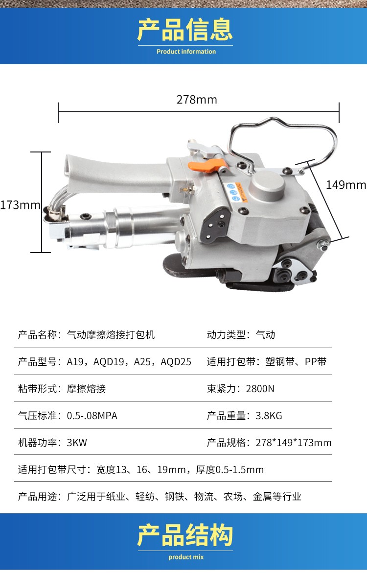 AQD19 Máy đóng kiện khí nén thắt chặt dây đeo tích hợp A19 Dây đeo bằng thép nhựa nóng chảy B19 Dây đai không có khóa PET