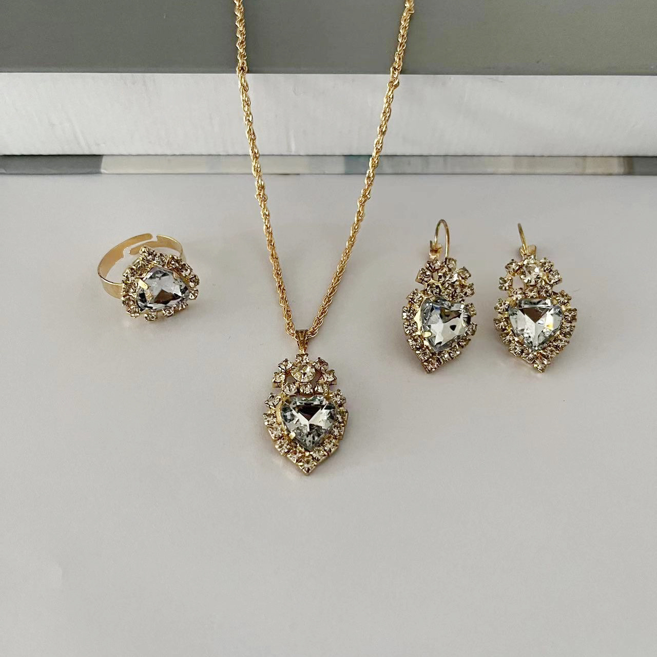 Âu Mỹ Mới Giọt Nước Tình Yêu Kim Cương Giả Bộ Bông Tai Vòng Cổ Nhẫn Cô Dâu Trang Sức Bộ 3 Phụ Kiện Đồng Hồ