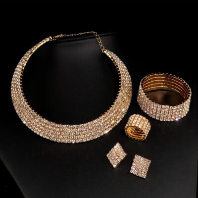 【宝贝名称】 欧美跨境满钻项链耳环戒指手镯四件套水钻镂空镶钻项圈新娘套装