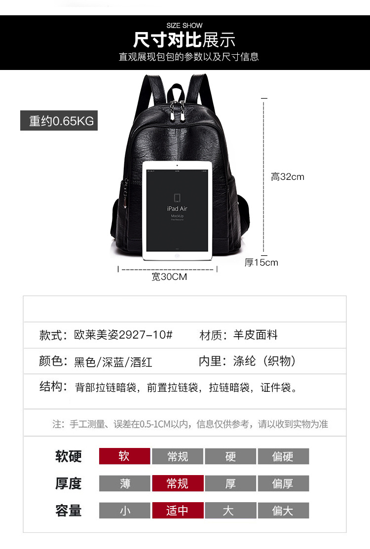 包包尺寸:包包尺寸:宽30cm*厚15cm*高32cm (手工测量,会存在一定误差,请以实物为准,谢谢)。可容纳ipad、手机、钱包、充电宝、化妆品等日用品。