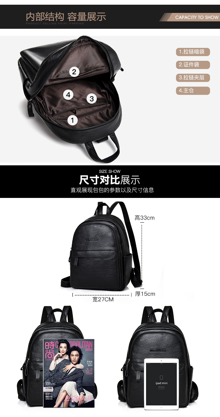 包包尺寸: 宽27cm*厚15cm*高33cm,您参考下。(手工测量,会存在一定误差,请以实物为准,谢谢)。可容纳ipad、手机、钱包、充电宝、化妆品等日用品。