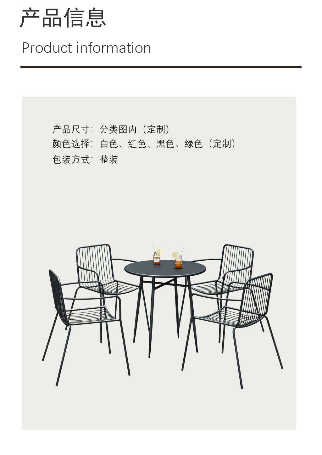 【定制时间】定制时间一般是3-5天,具体要看数量。铁艺产品不是随随便便弄一下就搞定的,有时候会还受到天气的影响,进而影响工期。桌子大部分是没现货的,因为大部分客户要求的尺寸是不一样,椅子有些款可能有现货,我们不能在客户购买之前作不实际的保证,但是后面确没做到,这样损失的还是客户的利益。阿里不像淘宝,阿里做的是长期生意,注重回头客,所以想要长期让客户来重复采购,希望客户能再采购前问清楚哦。